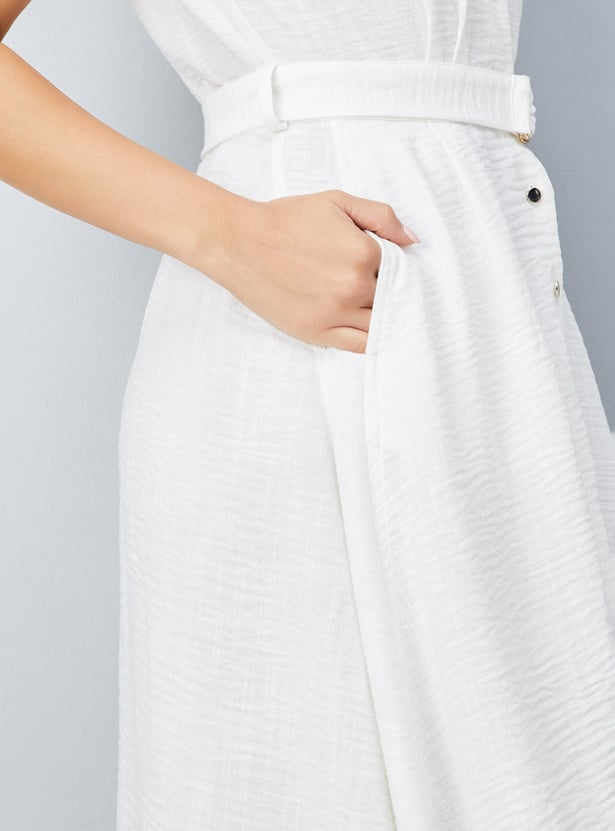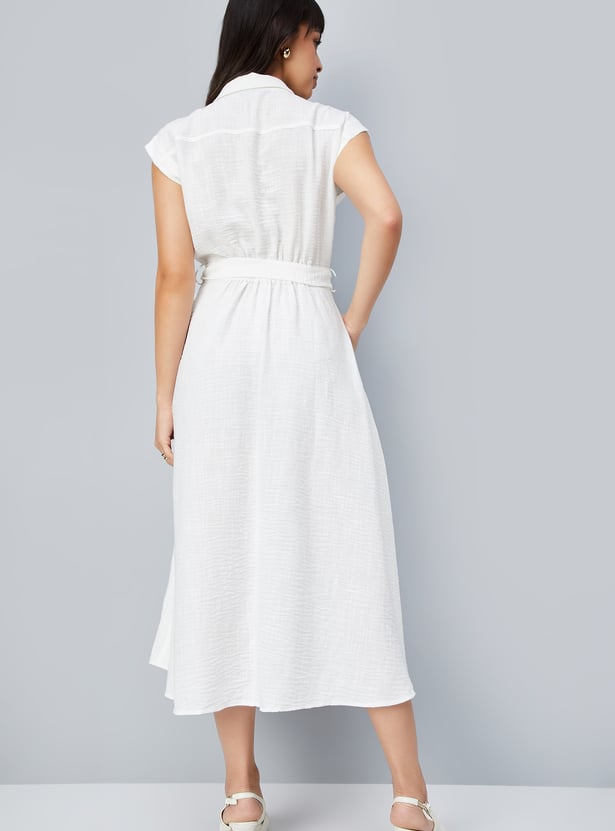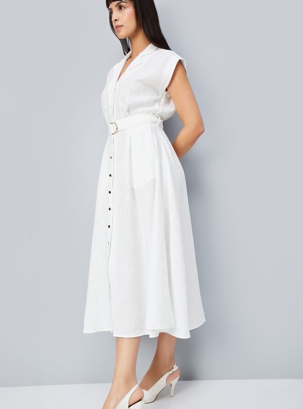 This solid A-line belted dress is a perfect blend of elegance and style, featuring a flattering midi length and a chic lapel collar. The button closure and half sleeves add a refined touch, making it a versatile piece for both casual and semi-formal occasions.