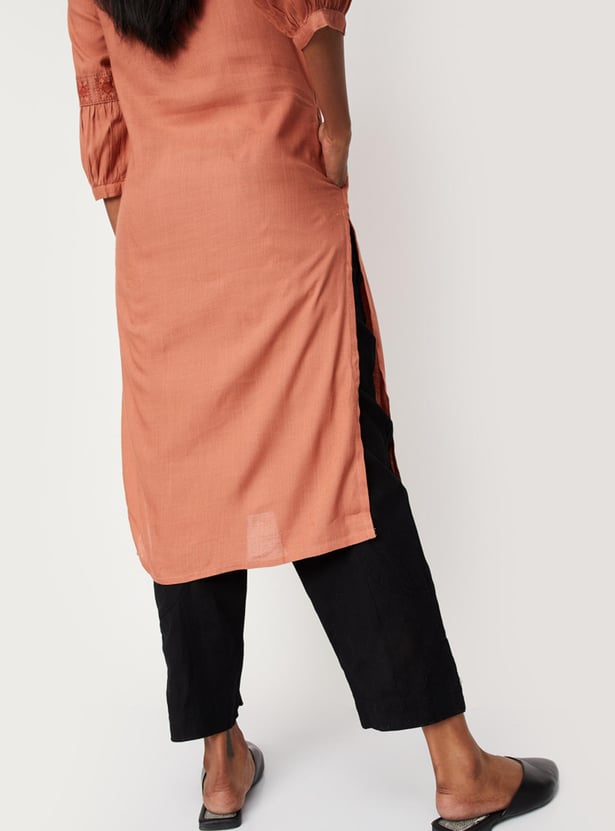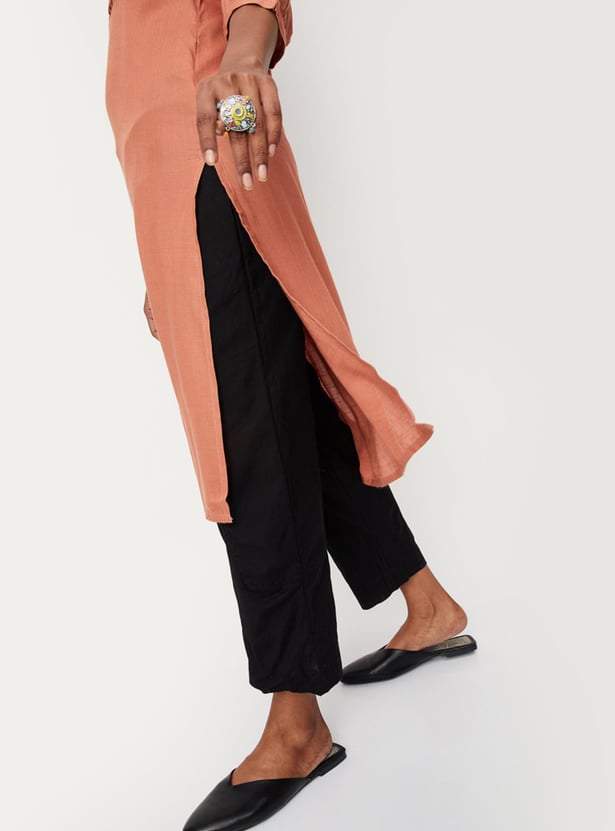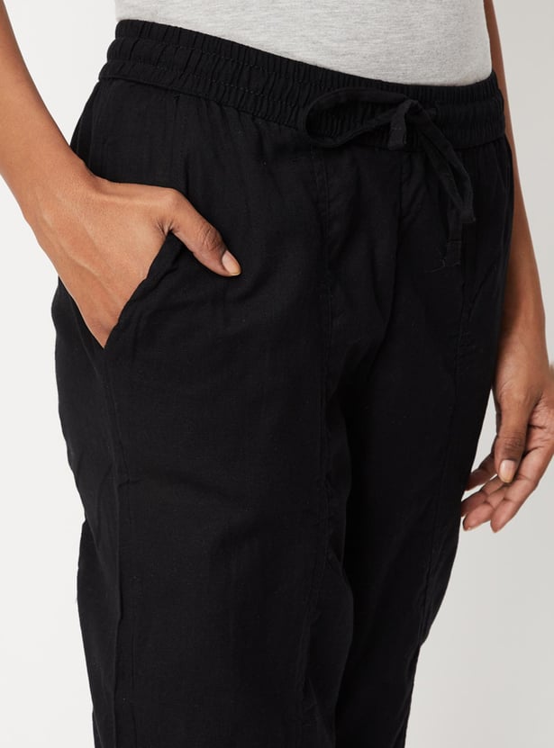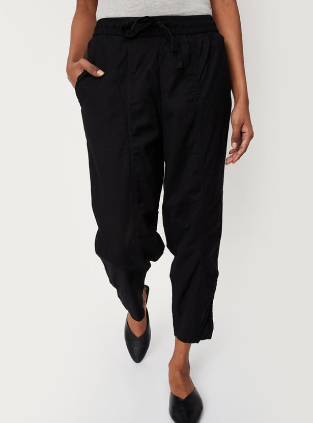 Take your style to new heights with this pair of casual pants crafted in a baggy profile and rendered in a solid tone. It features a drawstring waist, side pockets, and an ankle-length profile. Complete the look by styling these pants with a kurta, mules, and a tote bag.