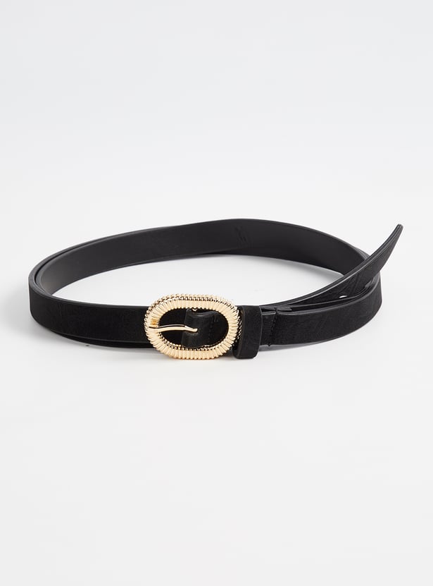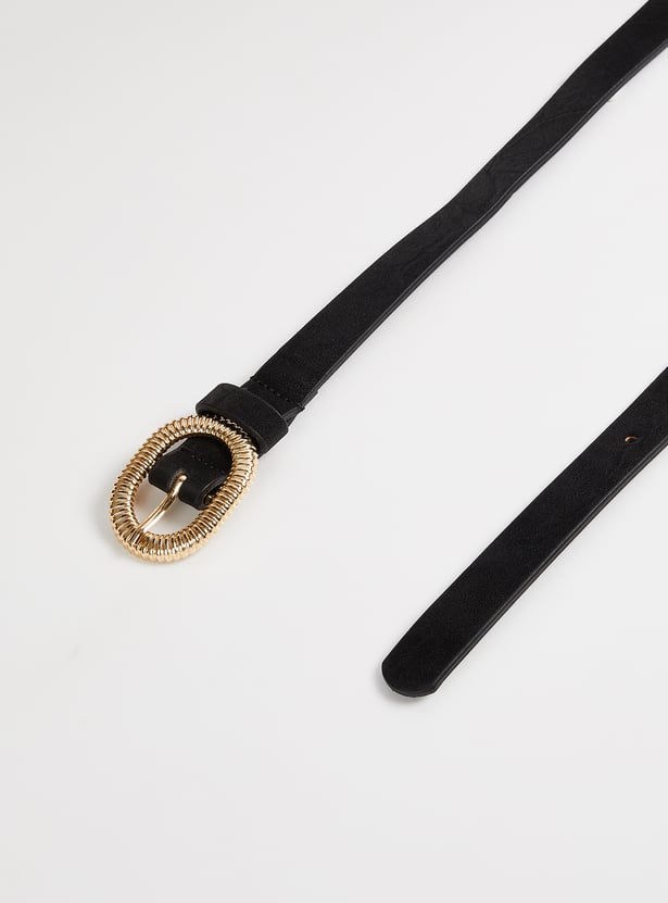 Add a refined edge to your look with this solid belt. Designed with a subtle textured finish, it features an oblong buckle with a ribbed design that brings a modern touch.