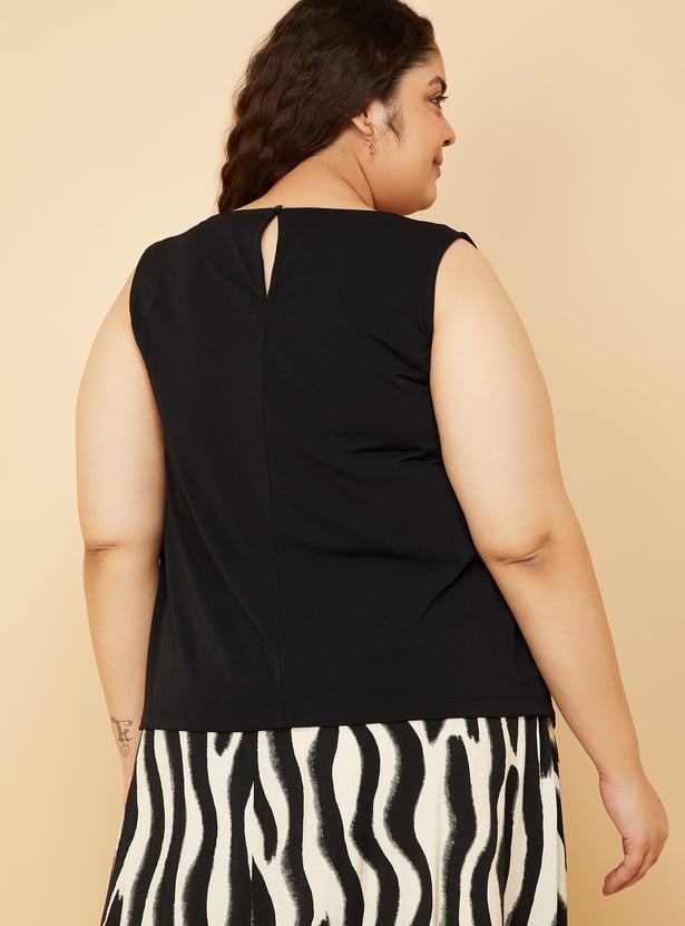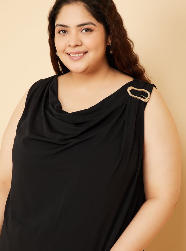 Sophisticated yet modern, this solid cowl neck top is designed to elevate your everyday style. Sleeveless for a sleek silhouette, it features a chic side metal buckle detail and a back button closure that adds both function and flair. Model Size :