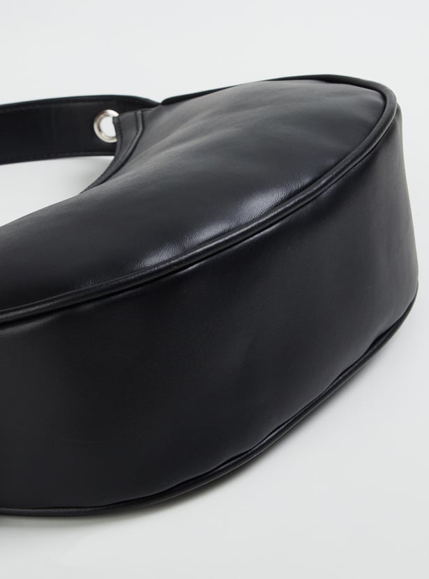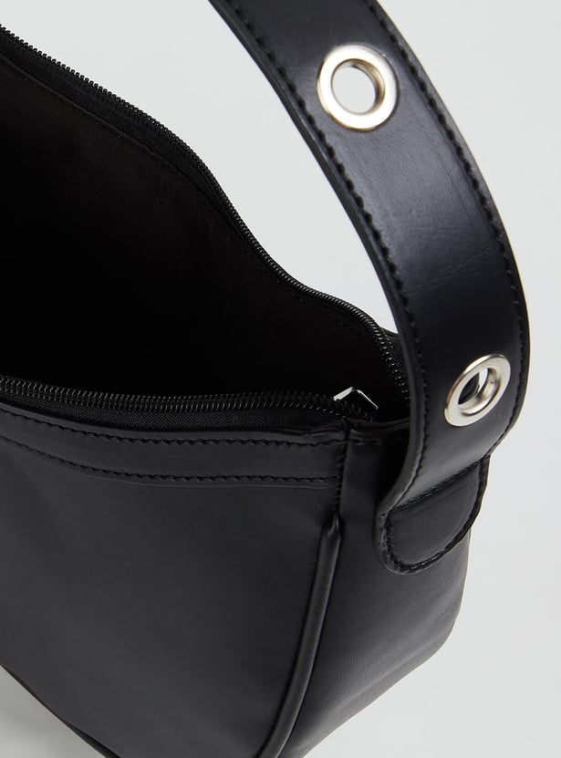 Infuse a Y2K-inspired look to your outfit with this crescent-shaped bag. It is designed with a solid shell and a compact zip compartment to stow your essentials. The handle is punctuated with grommet details for an edgy look.