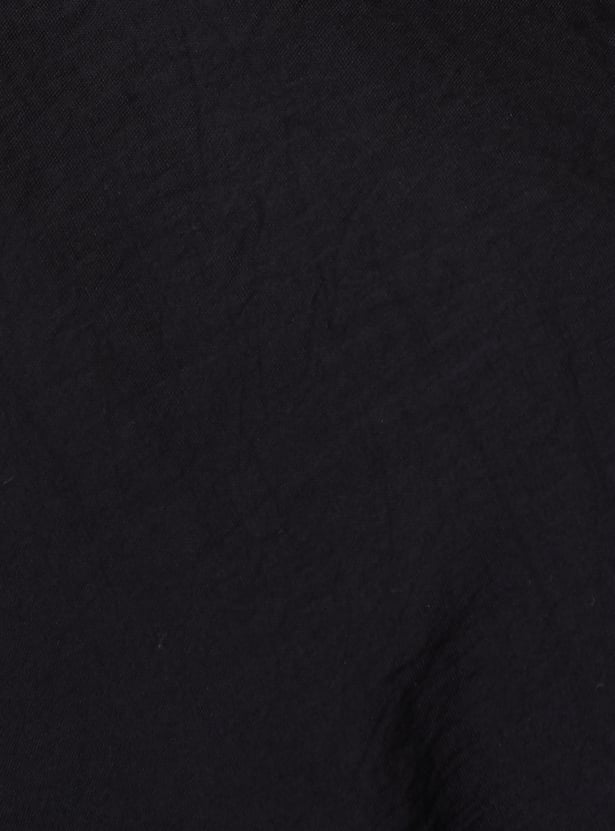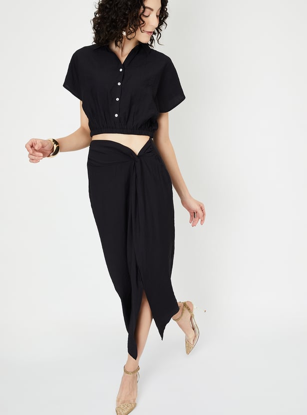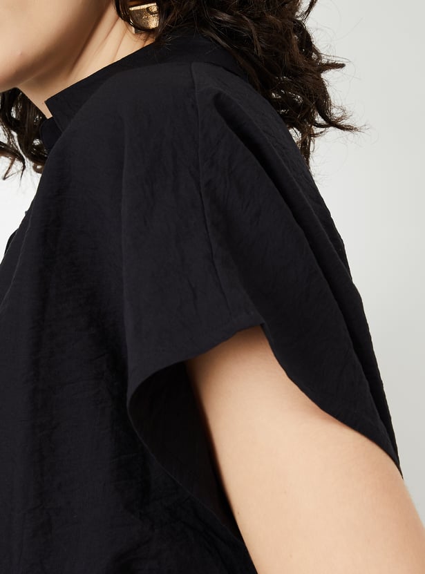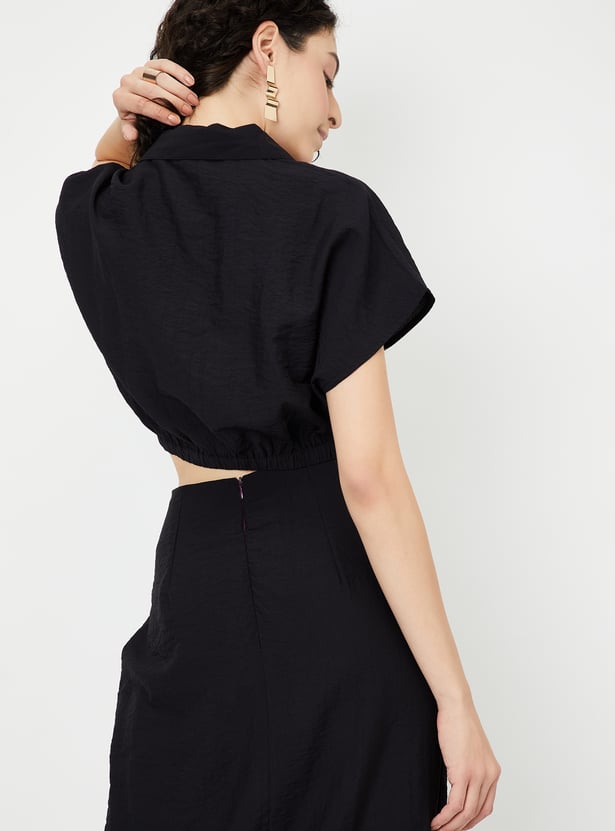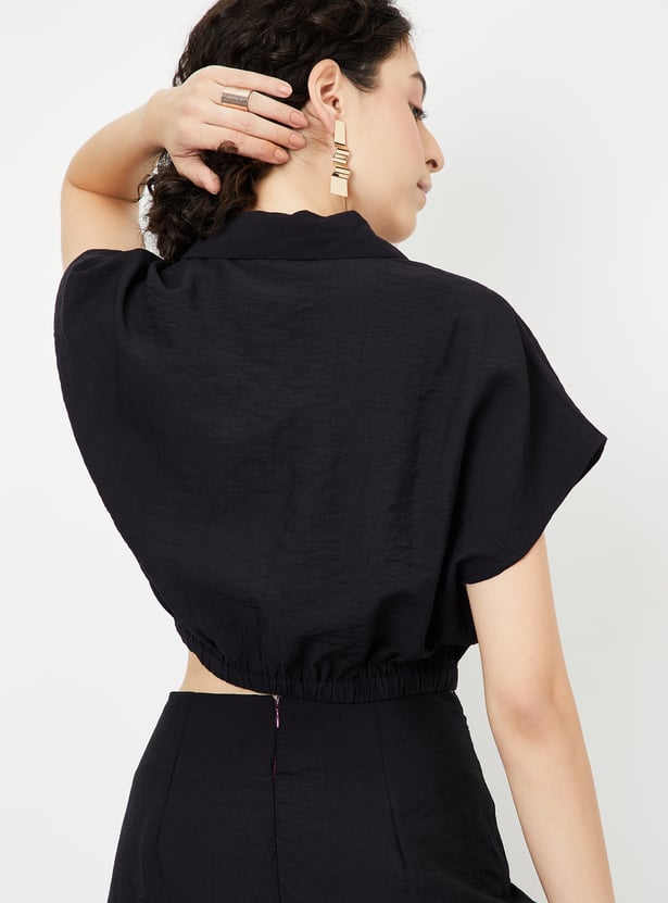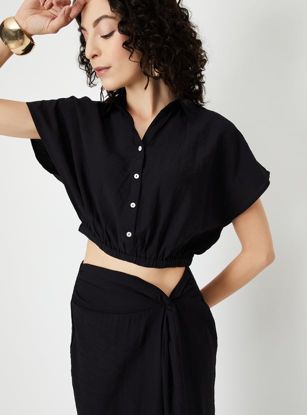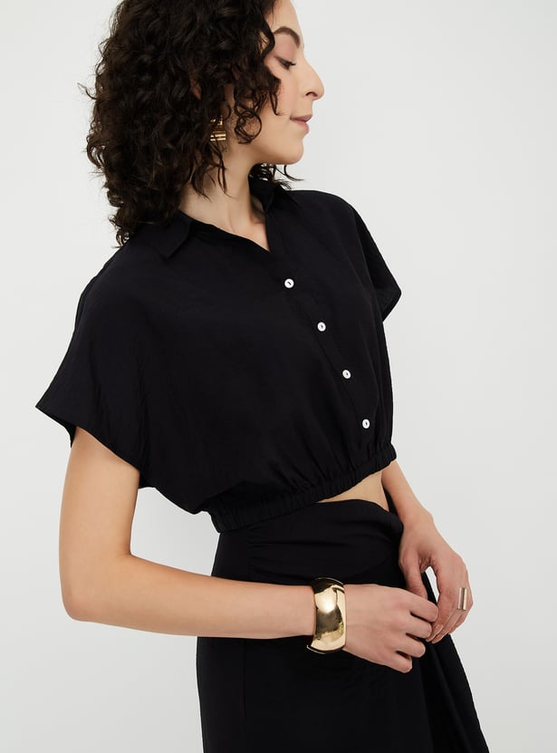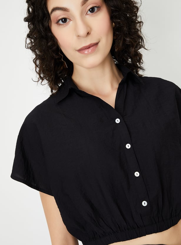 Enhance your style with this solid crop top, featuring a trendy spread collar and half-extended sleeves for a fashionable touch. The elasticated hem offers added comfort while providing a flattering silhouette.