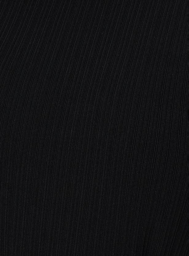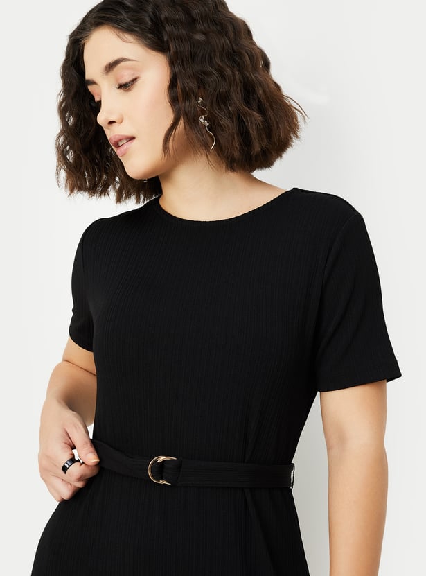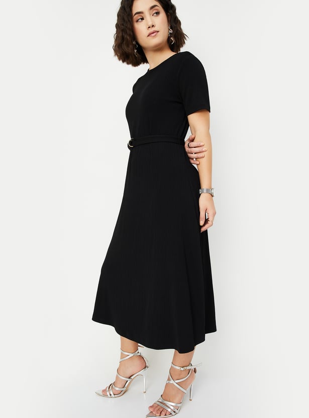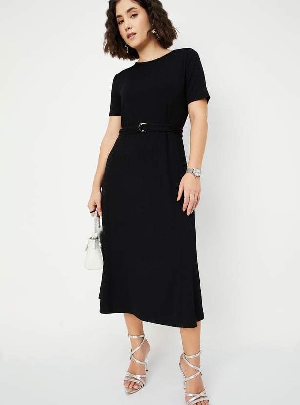 Women Solid Knit Belted Midi Dress