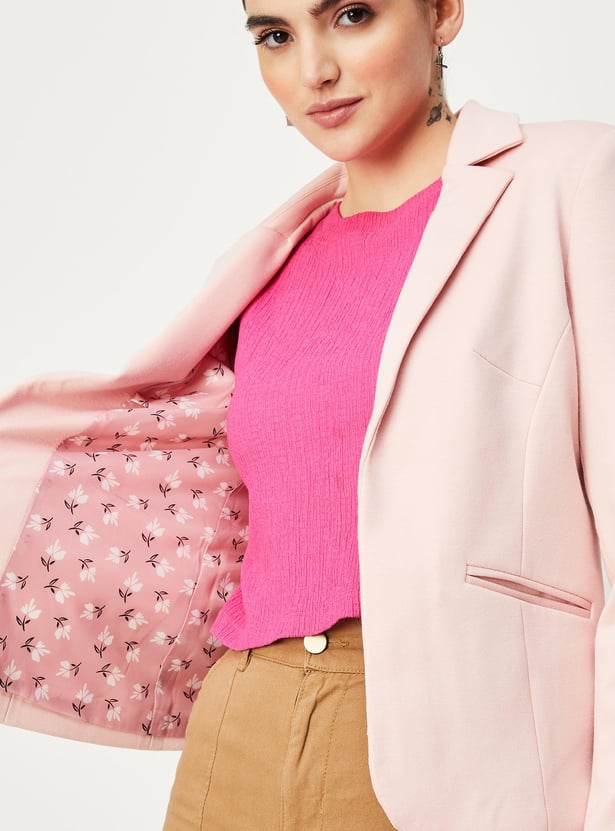 Slay in this solid blazer is tailored with a notched lapel, open front, full sleeves, and waist pockets. Layer it up with trousers and a blouse to complete the look.
