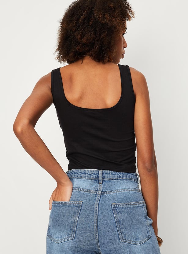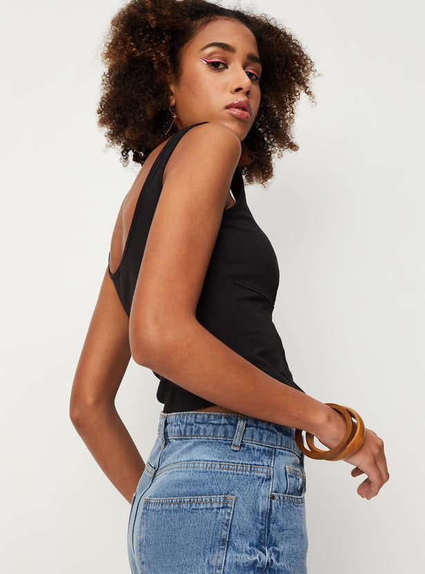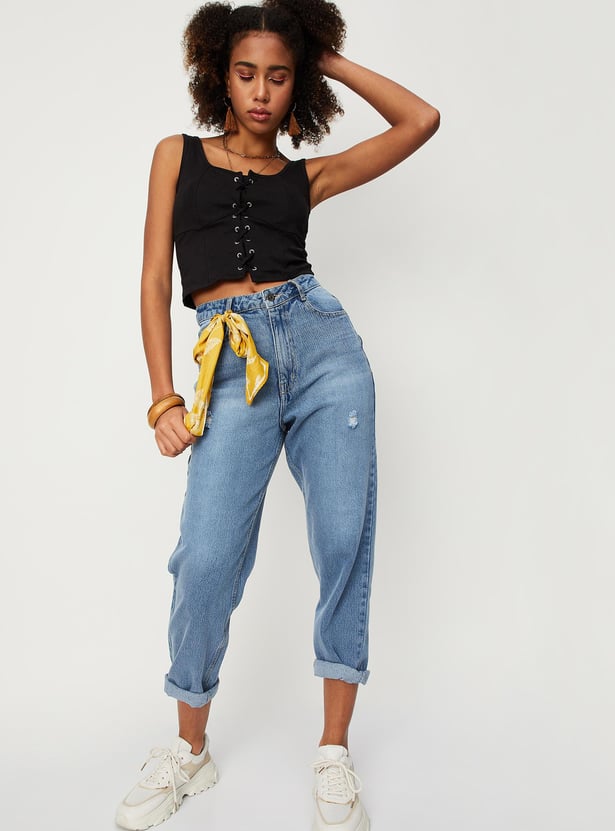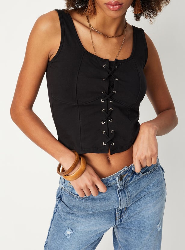 Flaunt your flattering style in this corset top. It is designed with a round neck, lace-up front, sleeveless construction, and a cropped profile. Style this top with a pair of jeans and sneakers to ace the look.
