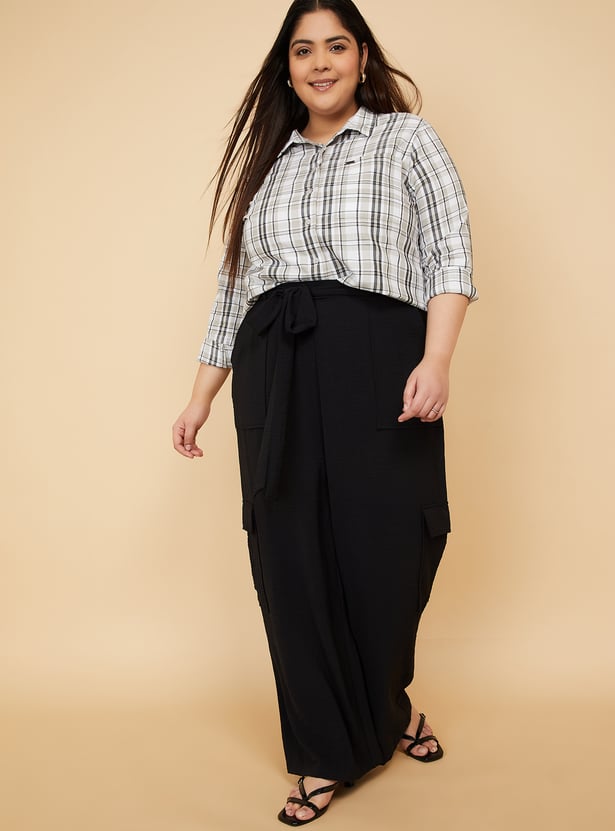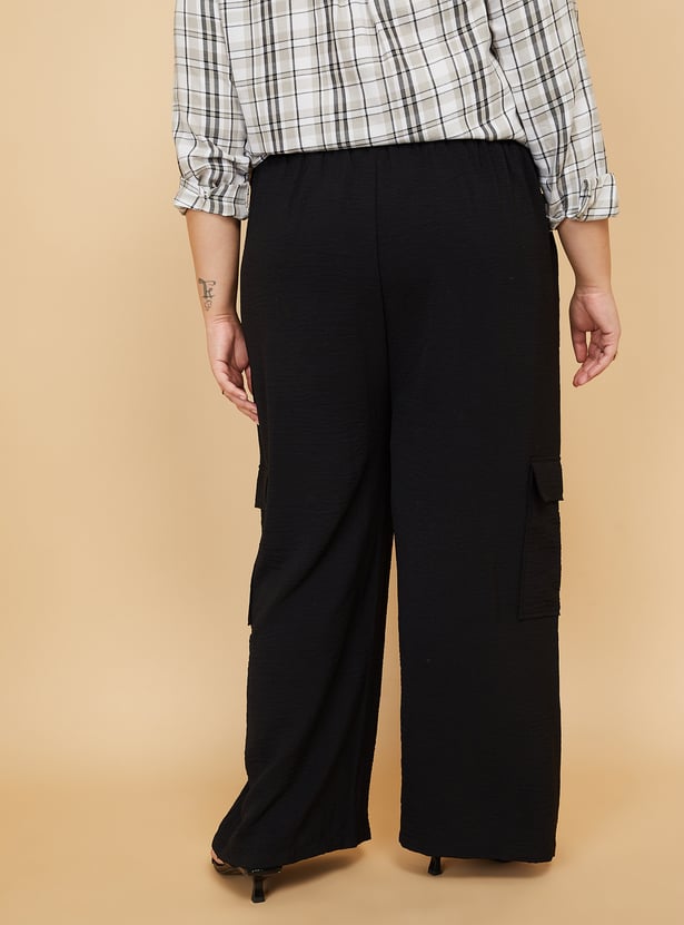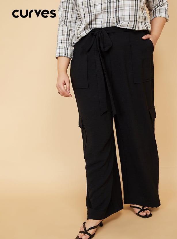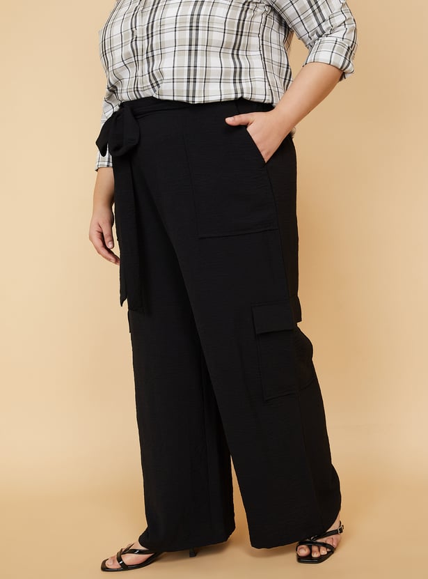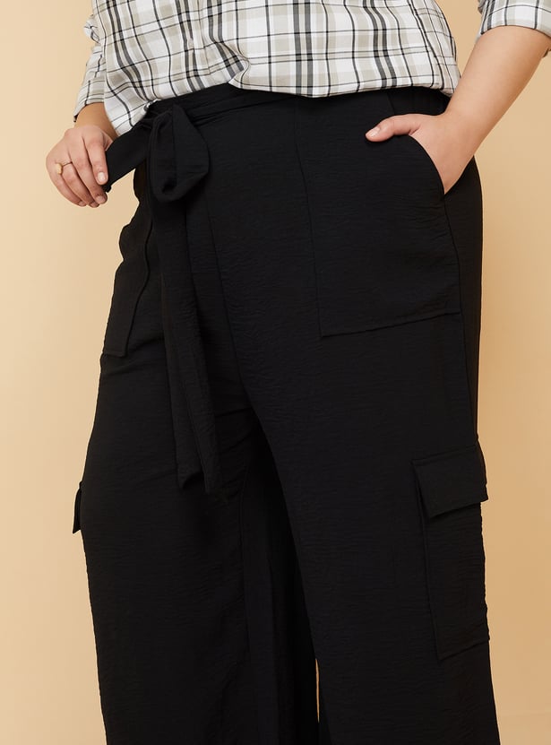 Stay effortlessly stylish with these solid loose fit cargo trousers. Designed with a comfortable tie-up at the waist and multiple pockets, they blend utility with relaxed fashion, making them perfect for everyday wear. Model Size :