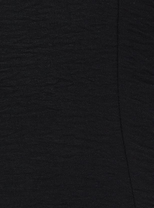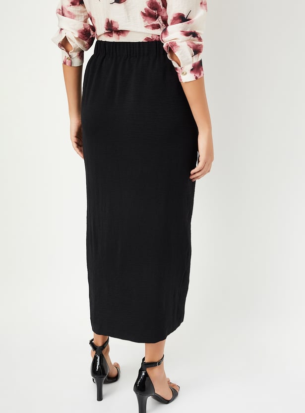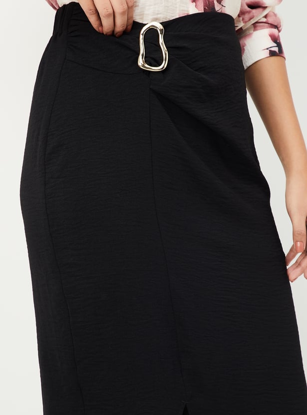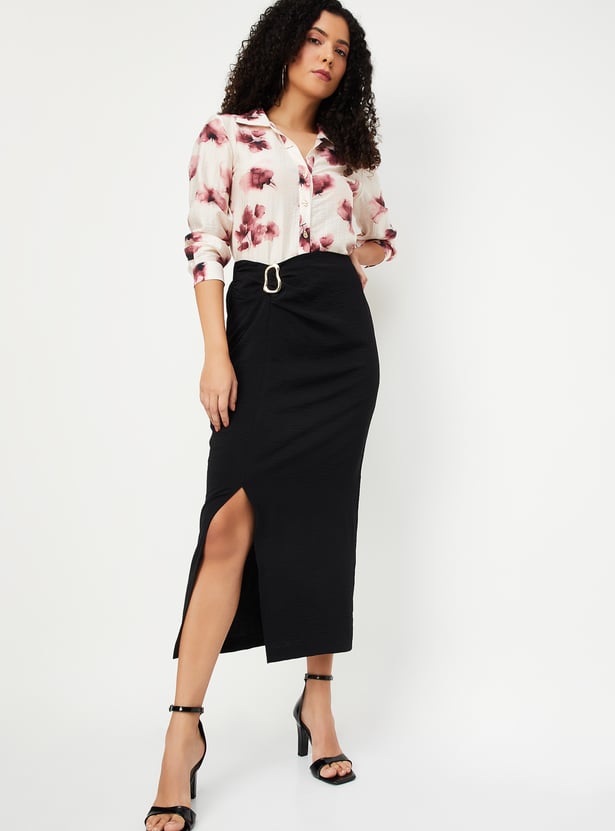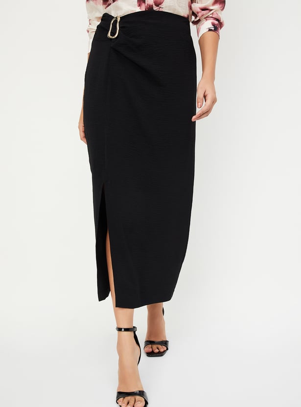 Flowy and flattering, this solid maxi skirt features a sleek belted waist and side slits for ease of movement and a hint of edge—perfect for versatile styling.
