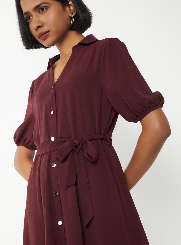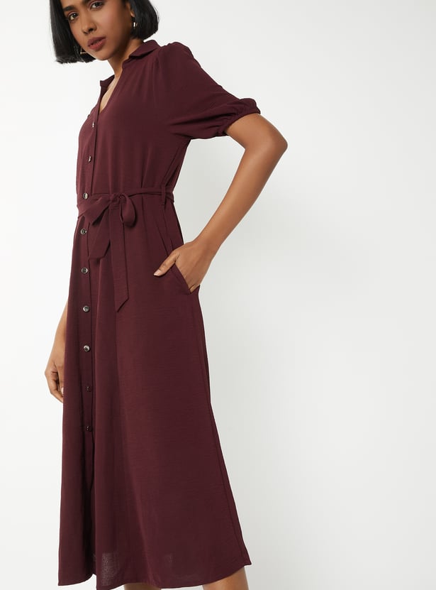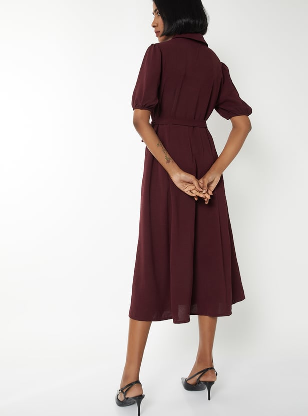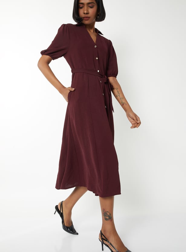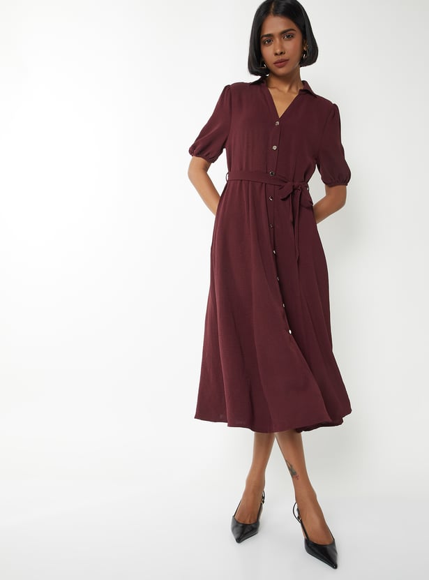 Elevate your everyday style with this solid midi dress, featuring a smart collared neck, belted waist, and half sleeves for a polished yet comfortable look.