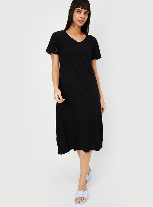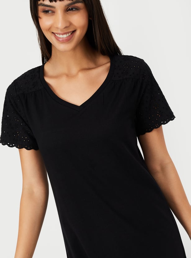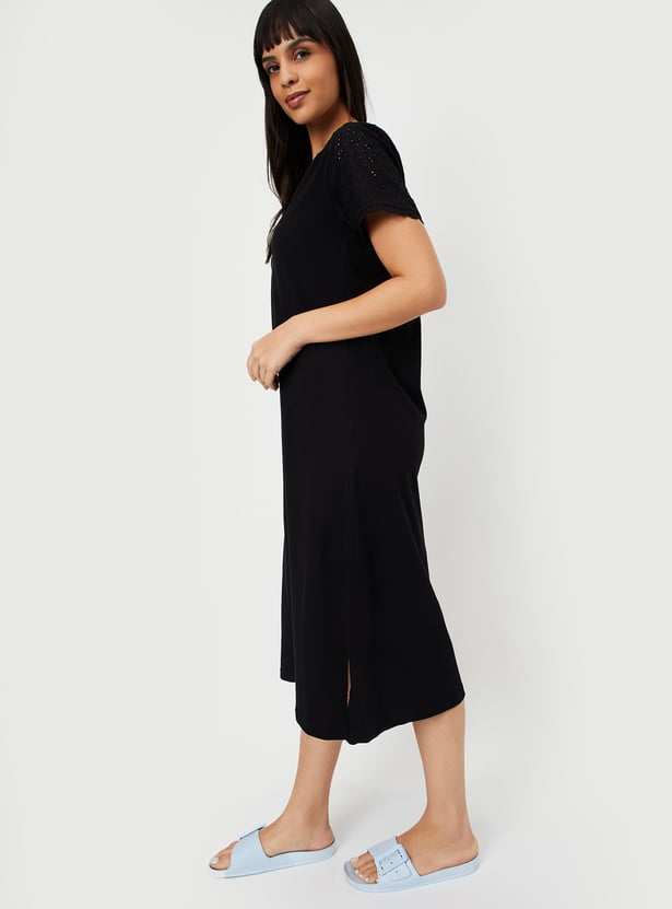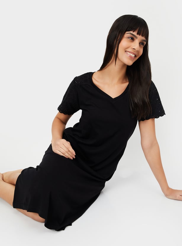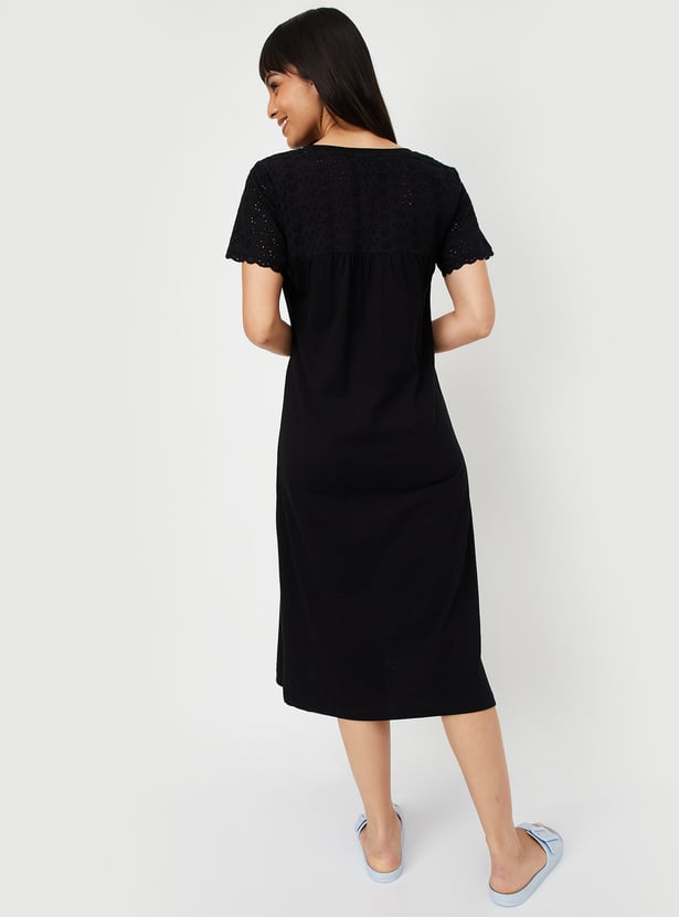 Relax in effortless style with this solid night dress, crafted for comfort with a touch of elegance. It features a V-neck and half sleeves, with delicate Schiffli embroidery adding charm to the sleeve edges. The calf-length silhouette offers ease and coverage for a restful night.