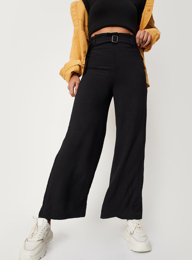 Own the room in this solid flared-fit pair of smart trousers that feature insert a paper-bag waistline with belt loops and a belted detail. Pair it with a solid crop top for a chic appeal.