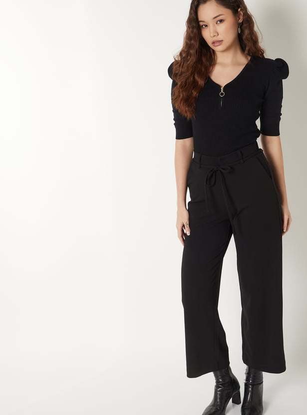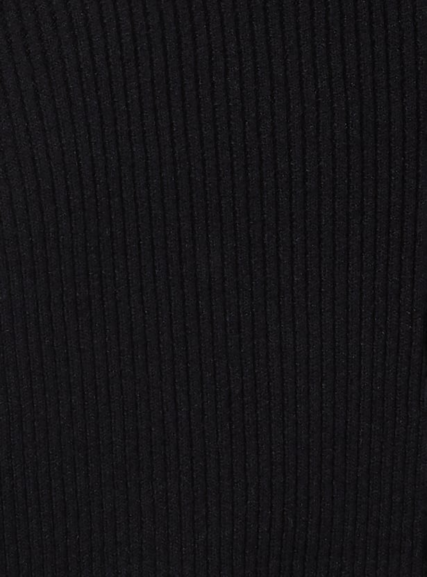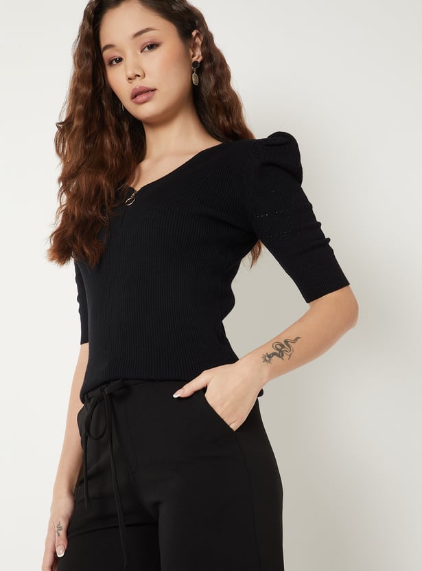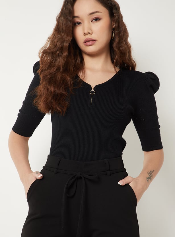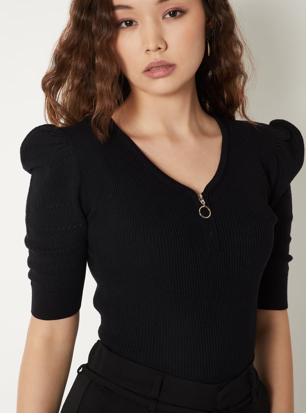 This top features a flattering V-neck with a sleek zip detail and half sleeves, giving it a modern edge. The ribbed texture adds definition, making it a chic upgrade to everyday basics.