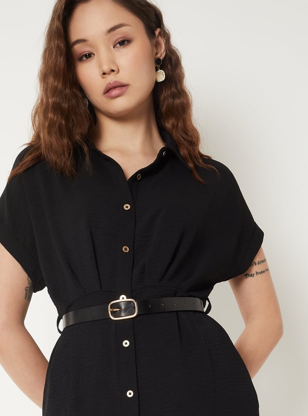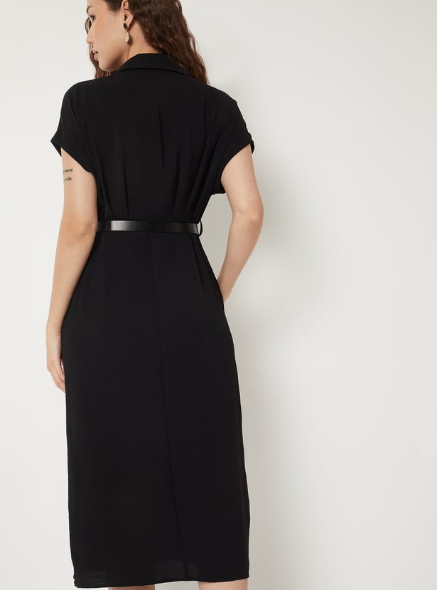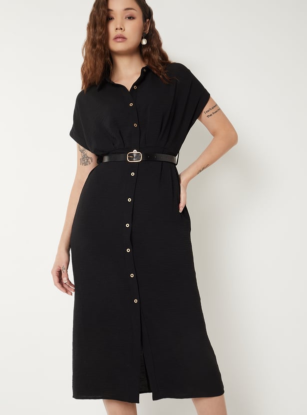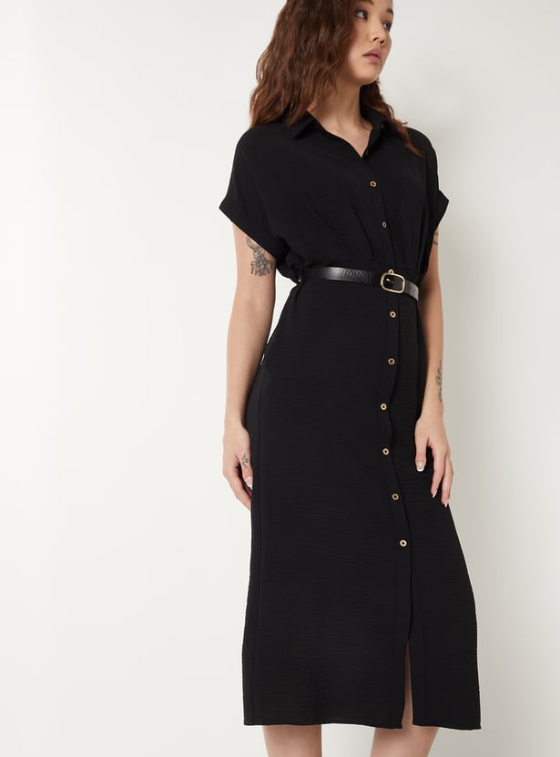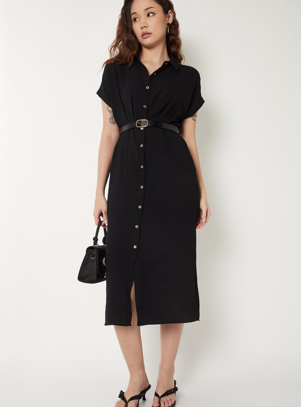 This solid shirt dress features a crisp spread collar, extended half sleeves, and a clean button-down front for a polished, minimalist silhouette. The belt cinches the waist, creating a flattering shape that shifts effortlessly from day to evening.