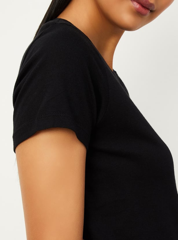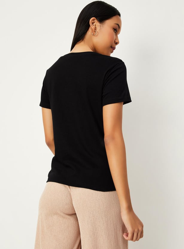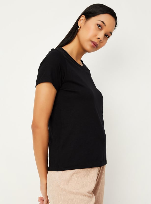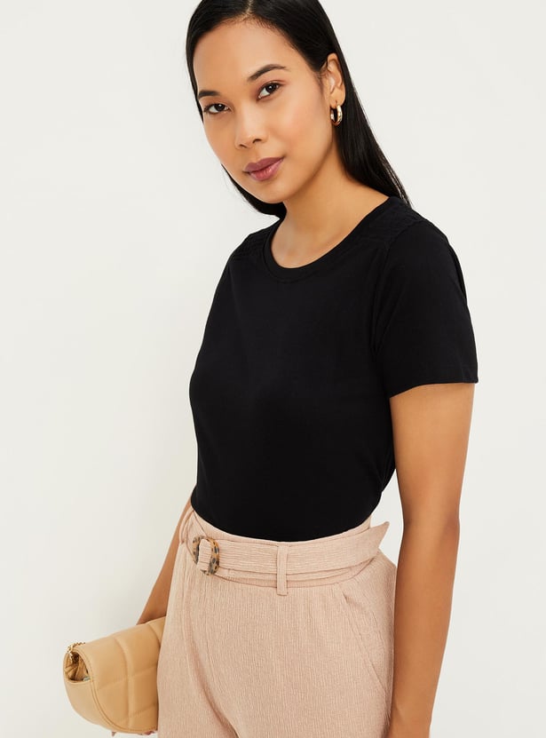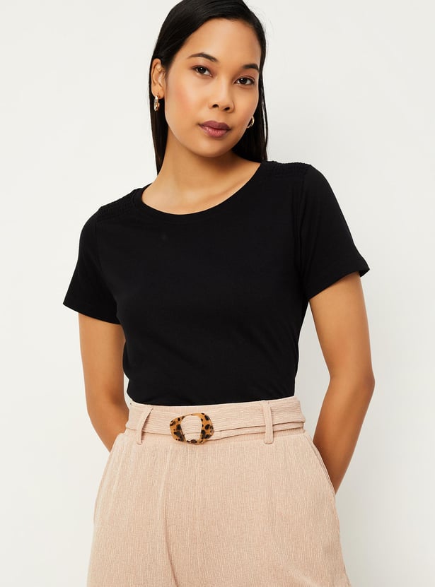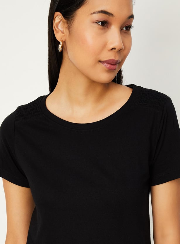 Elevate your casual look with this T-shirt featuring a smocked design on the shoulders. It has a round neckline and half sleeves. Pair it with jeans and sneakers to complete your outfit.