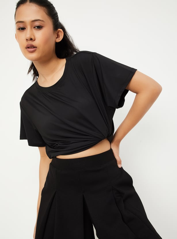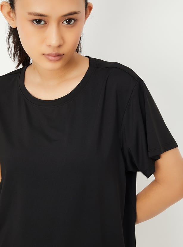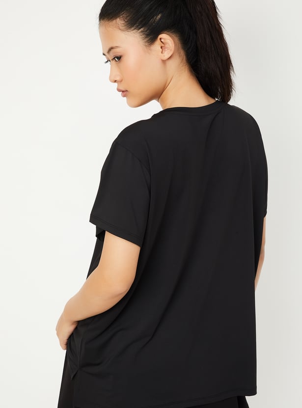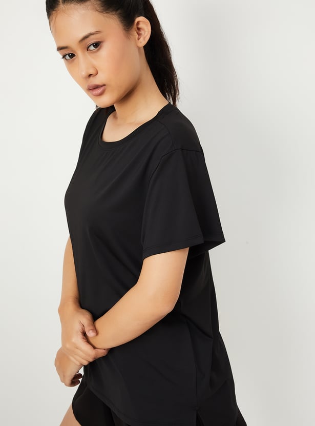 Designed for comfort and performance, this solid oversized t-shirt features a round neck and half sleeves for a relaxed fit. Made with quick-dry and anti-bacterial fabric, it keeps you fresh and cool—perfect for workouts or all-day wear.