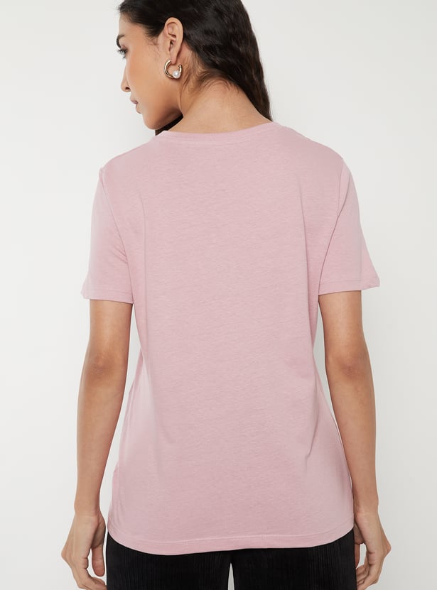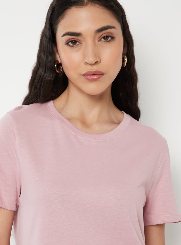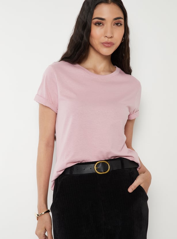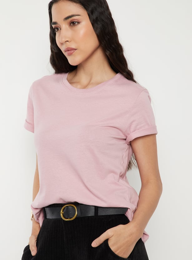 This solid T-shirt features a classic round neck and half sleeves, offering a fresh take on a casual essential. The soft, textured fabric adds subtle detail for everyday style with a twist. Model Size :