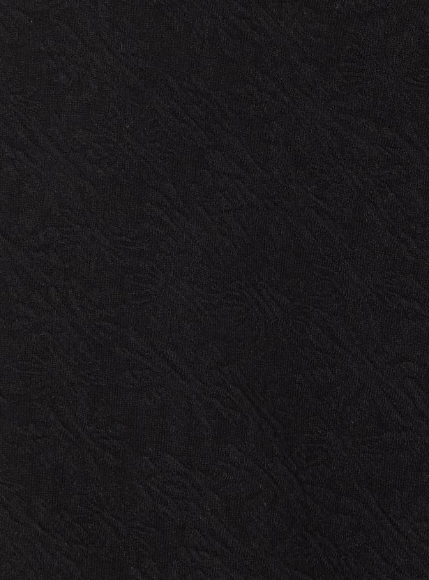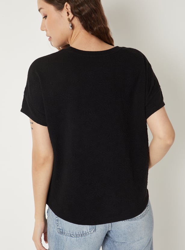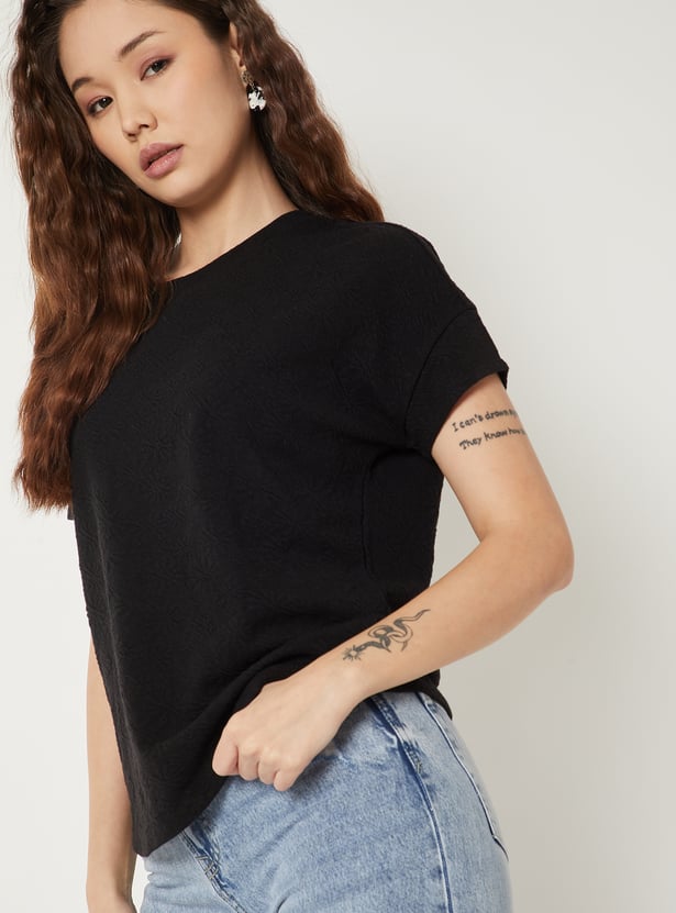 This solid textured top features a clean round neck, half sleeves, and drop shoulders for an effortlessly modern silhouette. The subtle texture adds depth, making it a chic staple for both work and weekend dressing. Model Size :