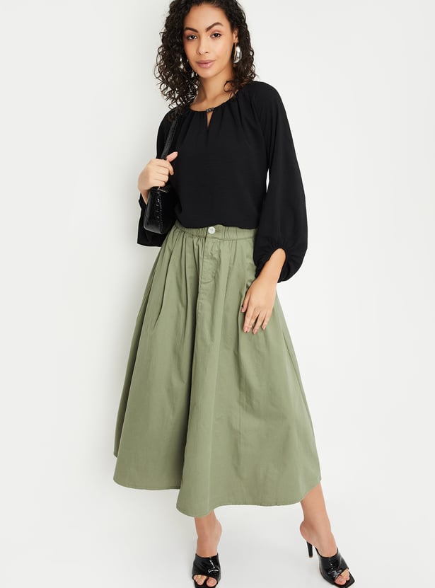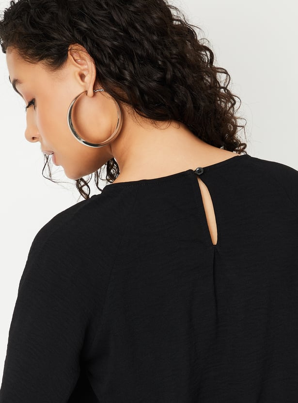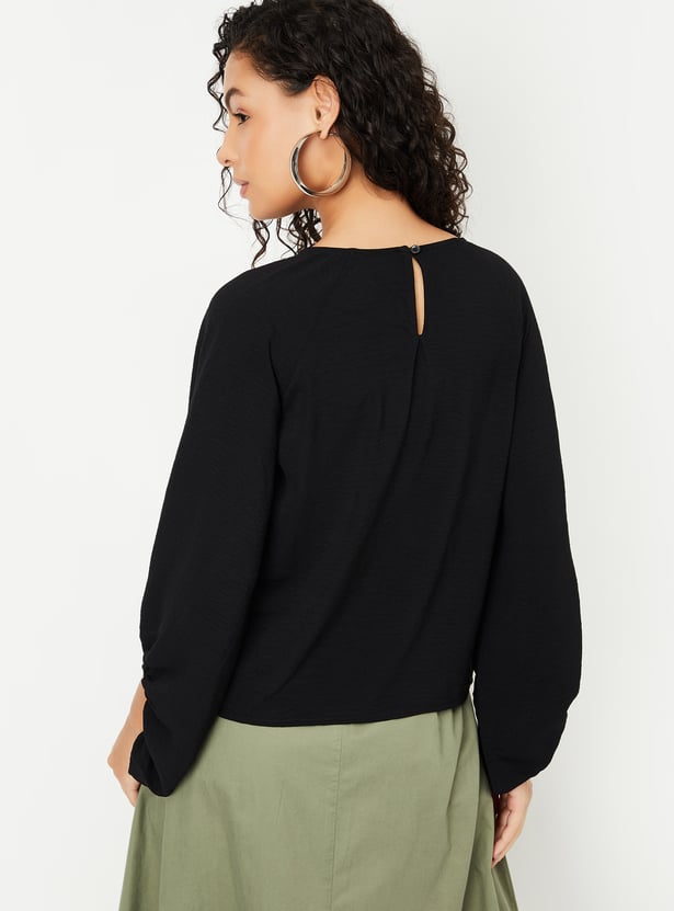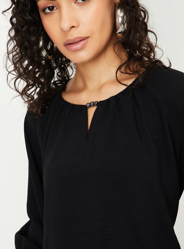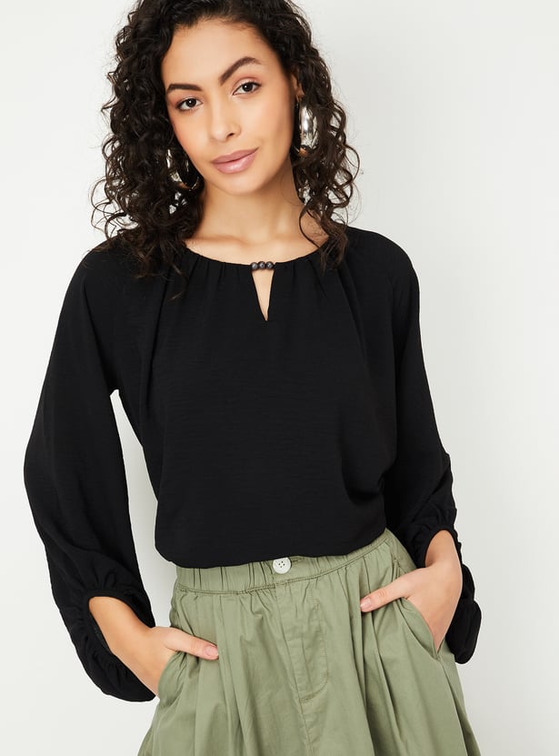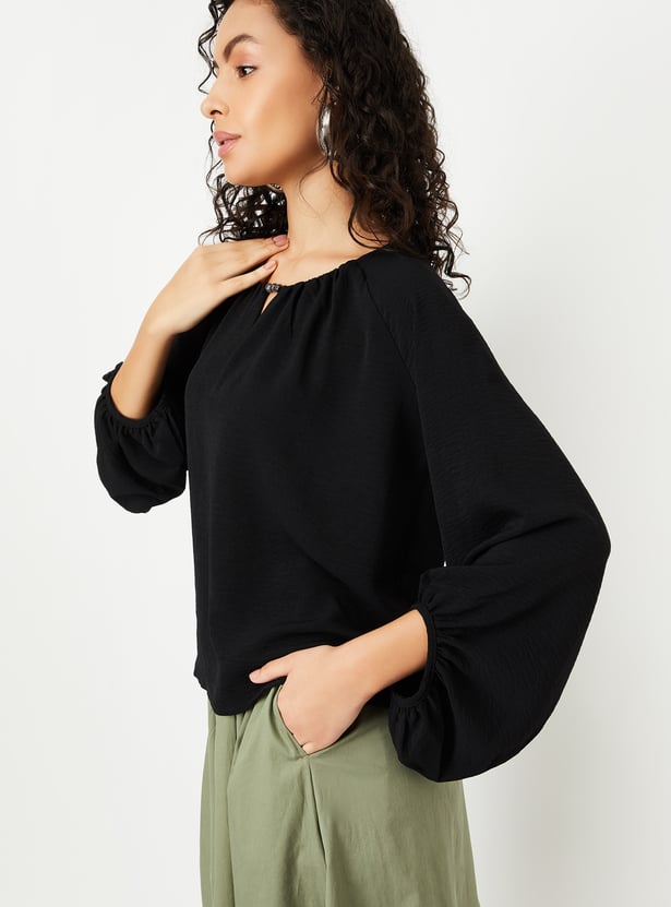 Elevate your casual wardrobe with this chic blouse featuring a keyhole neck and stylish balloon sleeves. The sophisticated design adds a touch of elegance to any outfit, making it perfect for both day and night.