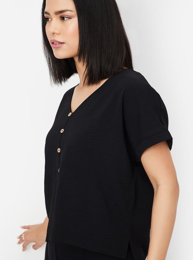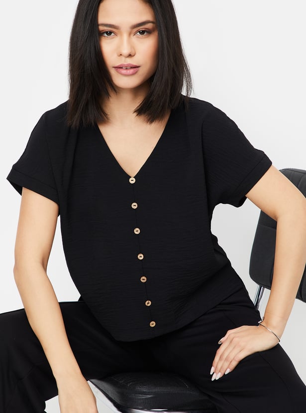 Elevate your everyday style with this solid top. Featuring a flattering V-neck and half sleeves, it’s a versatile piece perfect for casual outings or layering under jackets. Model Size :