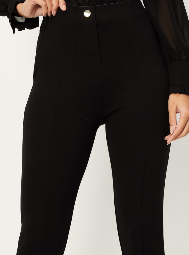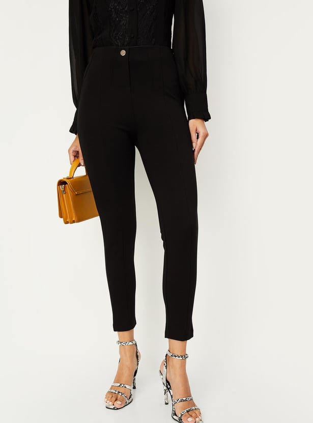 This pair of treggings is all about comfort and style. It has an ankle-length profile, and an elasticized waist with button fastening, and is finished in a solid tone. Put together a chic appearance by pairing these treggings with a shirt and mules.