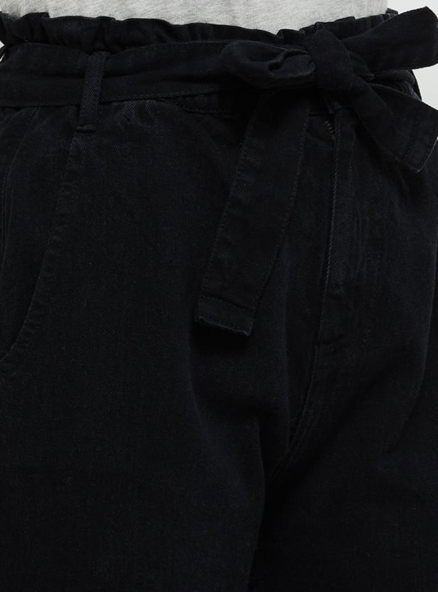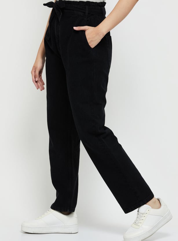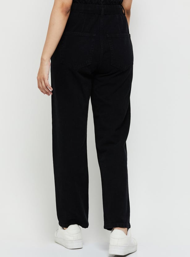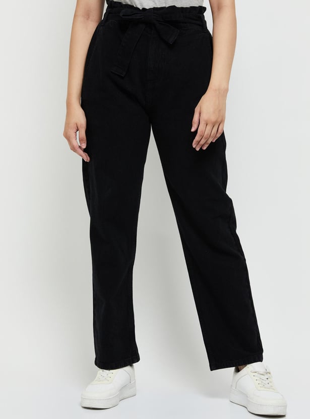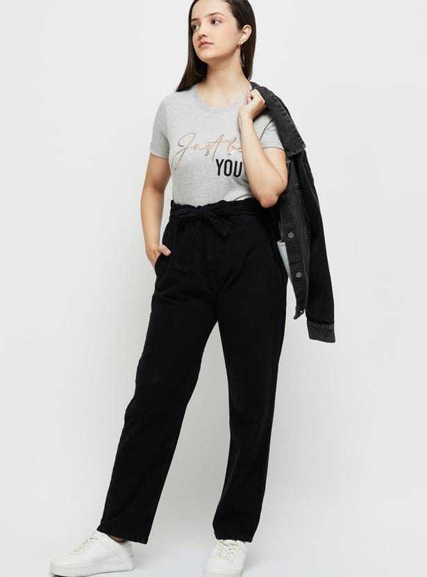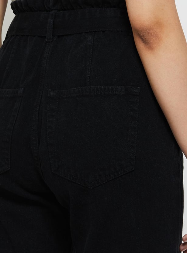 Always remain chic in this pair of boyfriend-fit jeans that are designed in a 4-pocket construction, along with an elasticated waistband and a belt detail in a solid-washed design. Pair these jeans with a cropped top for optimal style.