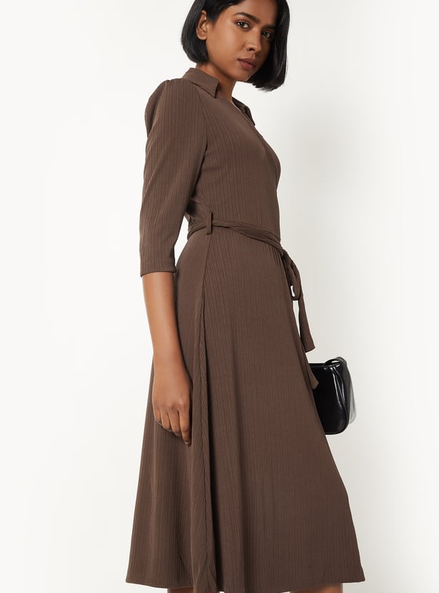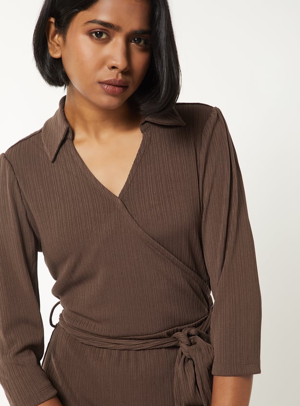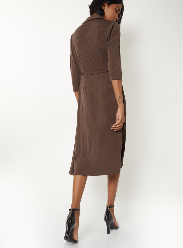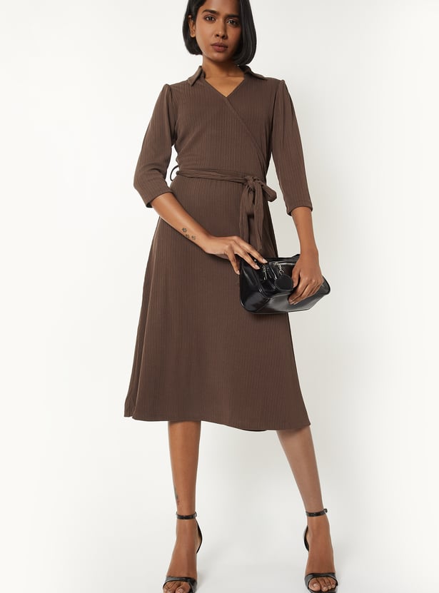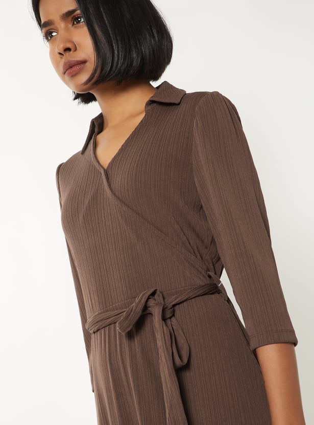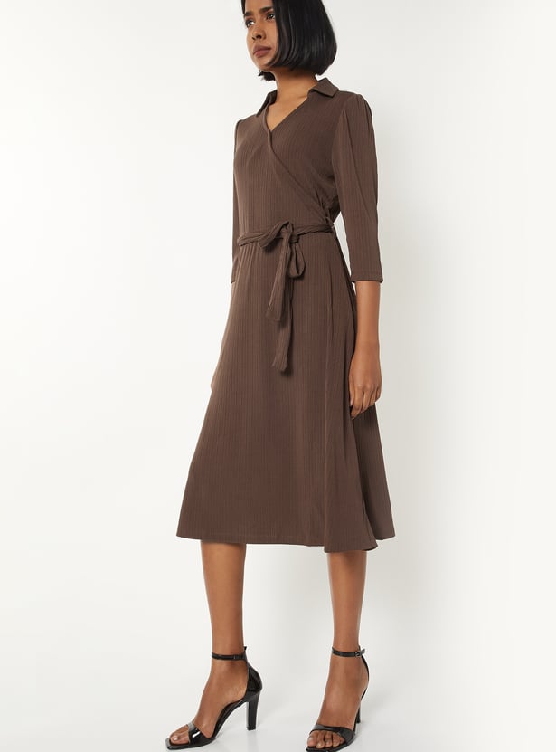 This solid, textured, wrap midi dress features a collared neckline, 3/4th sleeves, and a tie-up detail at the waist that flatters the figure with effortless sophistication.Model Size