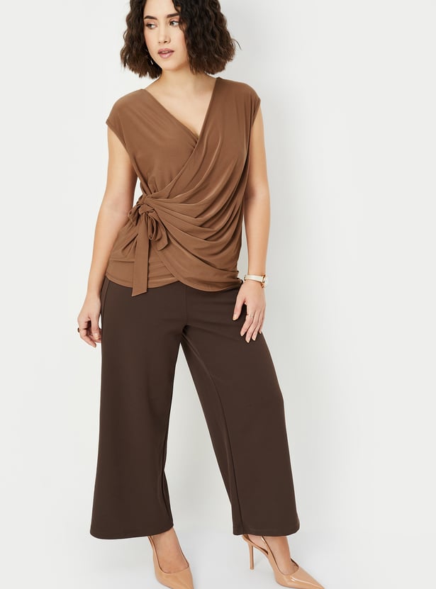Embrace a chic and sophisticated look with this solid wrap top. Featuring a flattering V-neck, a tie-up front, and extended sleeves, it combines elegance with a touch of modern style.