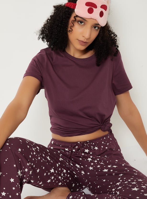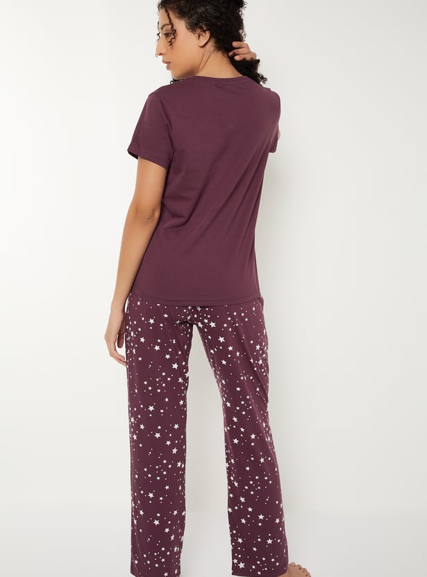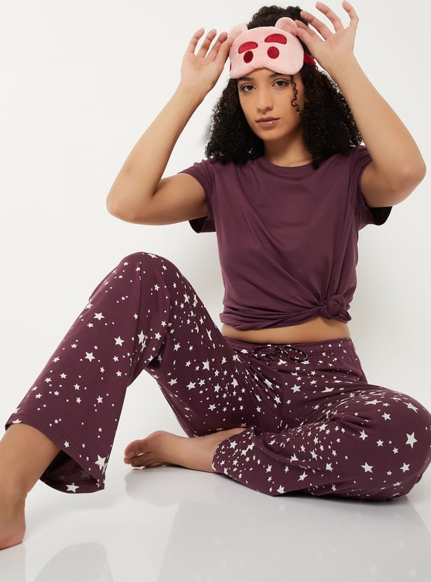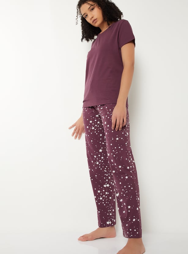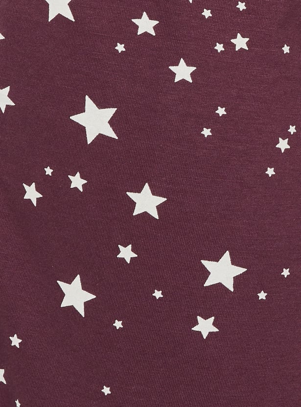 Relax and chill in style with this printed sleepwear set. The T-shirt features a round neck and half sleeves, while the matching all-over star printed pyjamas come with an elasticated waist and drawstring for ultimate comfort and a fun, laid-back vibe.