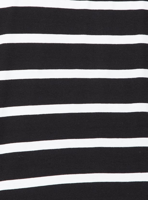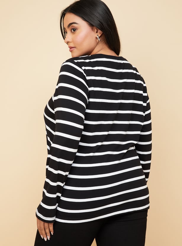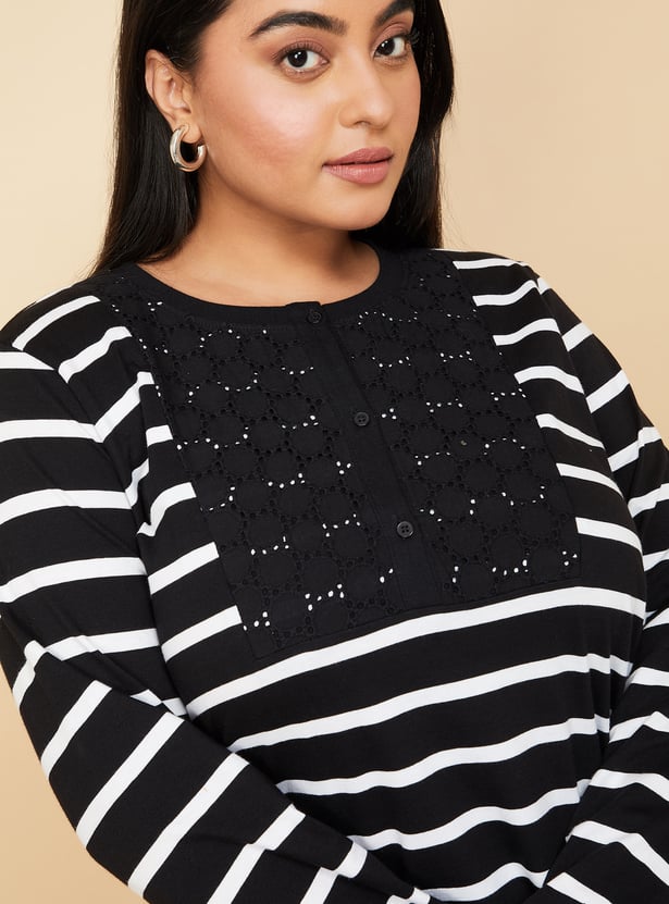 Level up your style with this T-shirt, featuring a striking striped design. With a classic henley neck adorned with buttons, a lace detail yoke, and full sleeves, it effortlessly combines trendiness and comfort. Model Size :