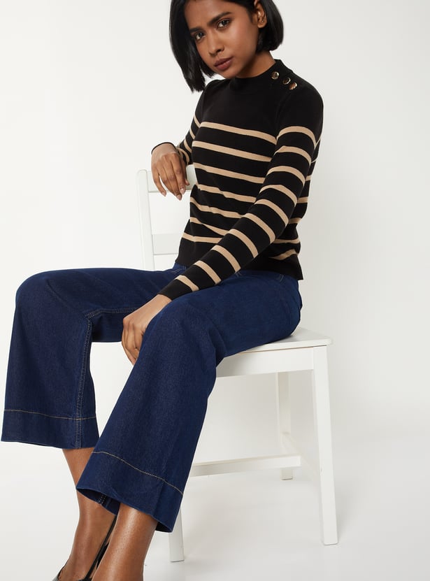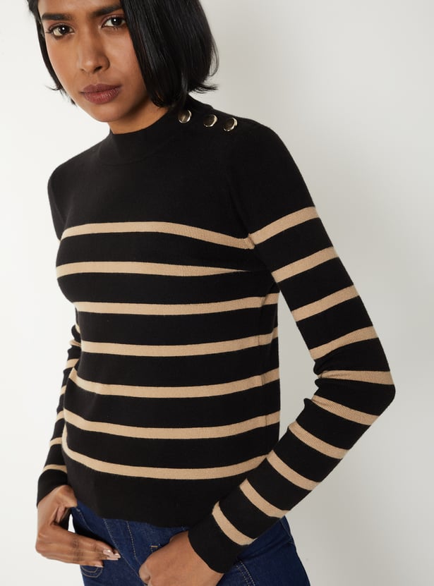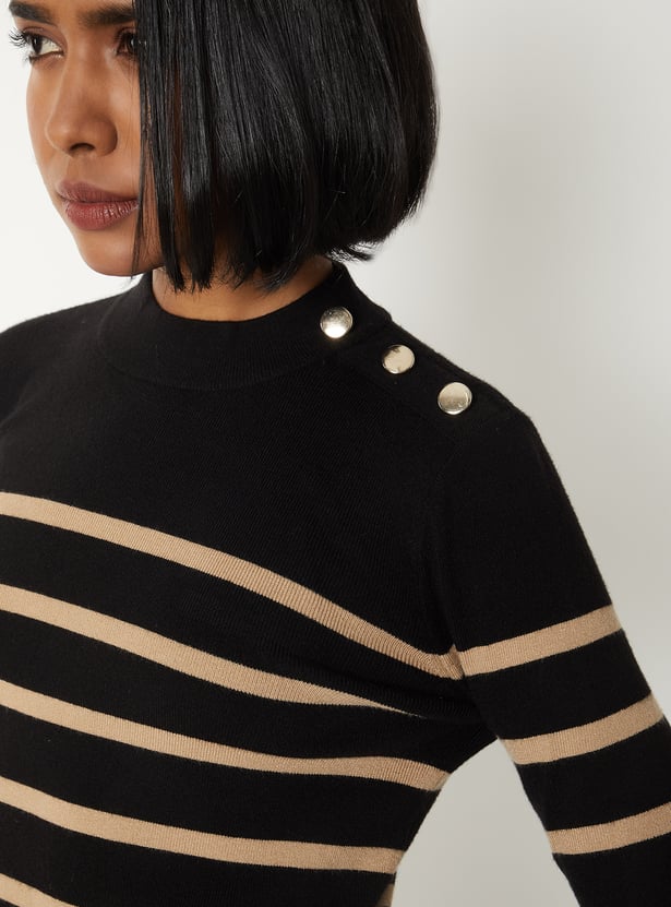 This cosy striped sweater has a round neckline, full sleeves, and chic button detailing along the shoulder for a chic look. Crafted for warmth with a touch of understated charm. Model Size :