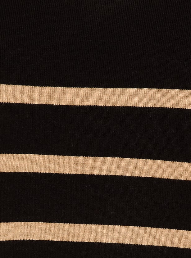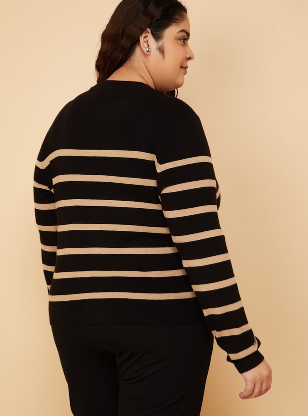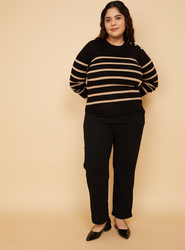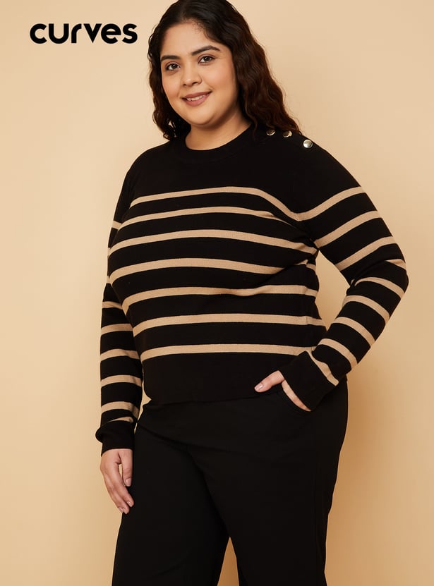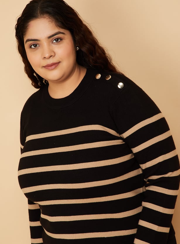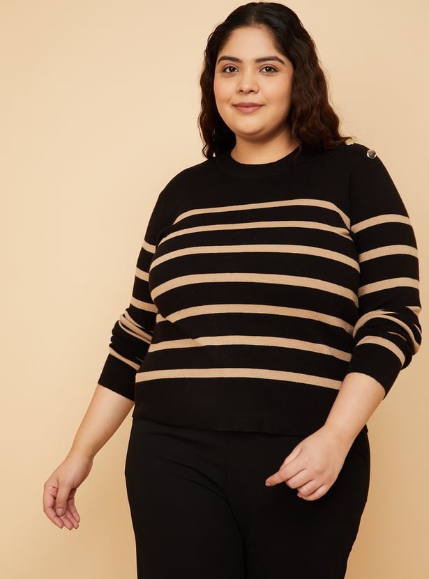 This cosy striped sweater has a round neckline, full sleeves, and chic button detailing along the shoulder for a chic look. Crafted for warmth with a touch of understated charm. Model Size :