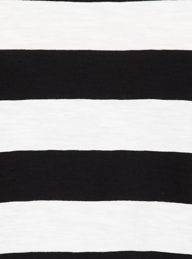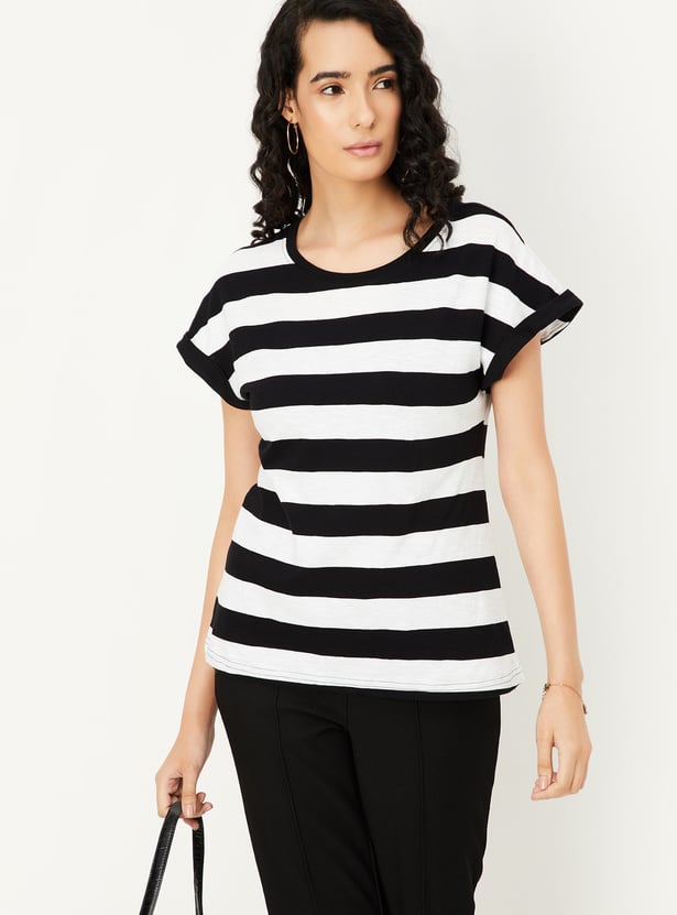 An ideal pick for a casual wardrobe, this striped T-shirt is designed with a round neckline and extended half sleeves. Its classic pattern and comfortable fit make it perfect for everyday wear.