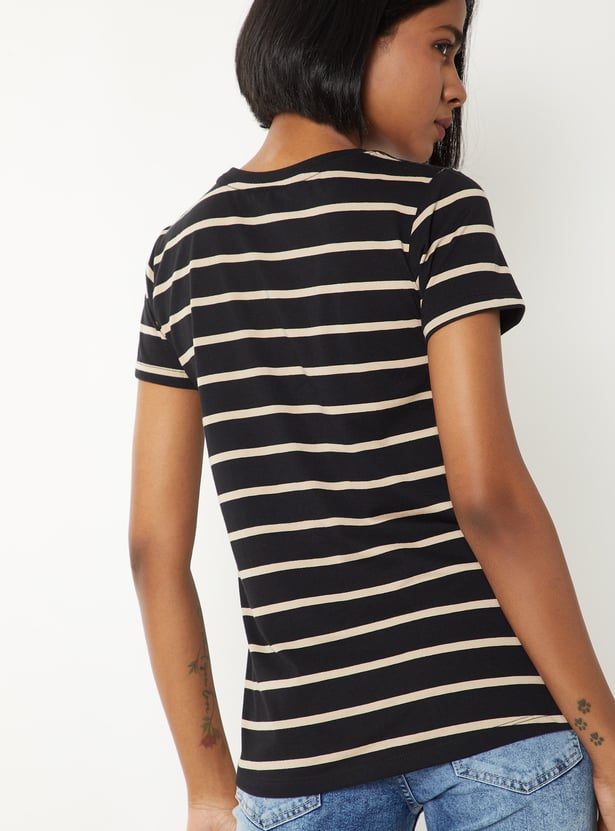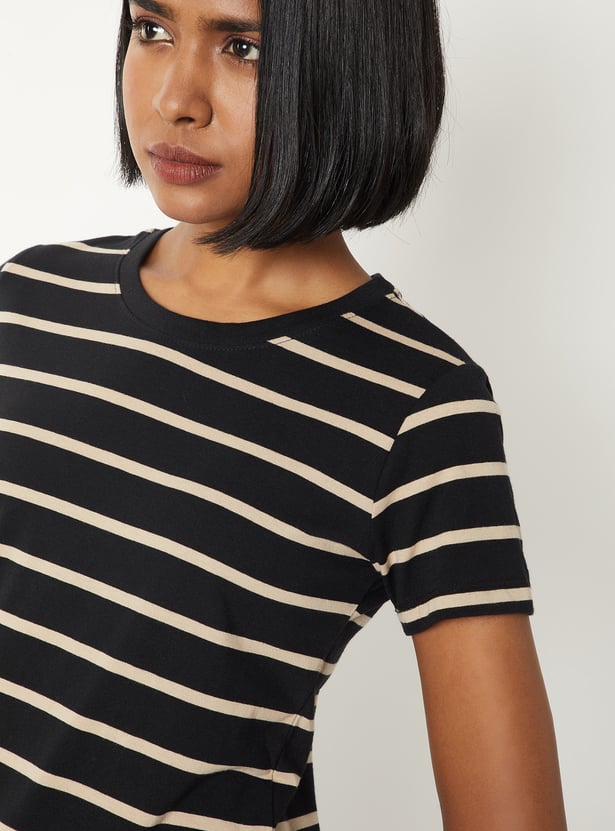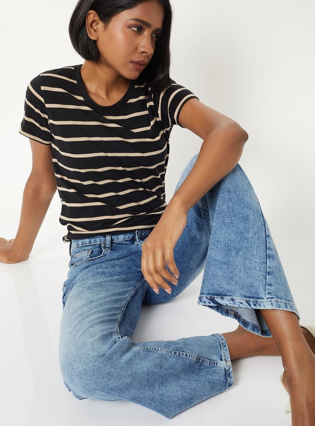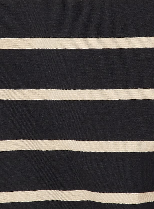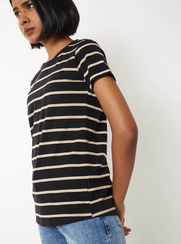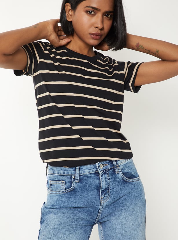This striped T-shirt features a classic round neckline and comfortable half sleeves, offering an effortless blend of casual style and everyday comfort. Perfect for laid-back days or relaxed outings. (