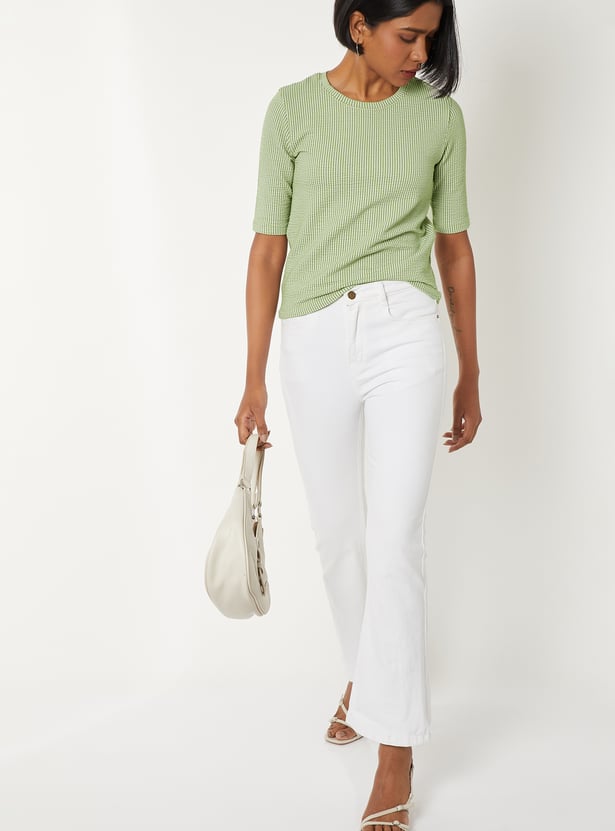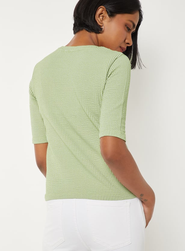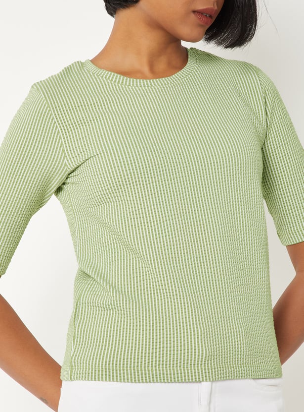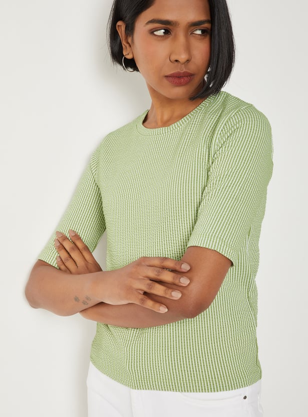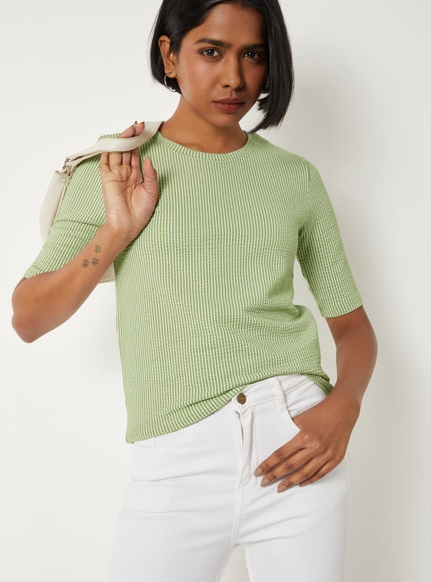 Elevate your everyday style with this striped T-shirt, a classic piece that never goes out of fashion. Designed with a round neck and half sleeves, it offers both comfort and versatility, making it perfect for casual outings or layering under jackets. Model Size :