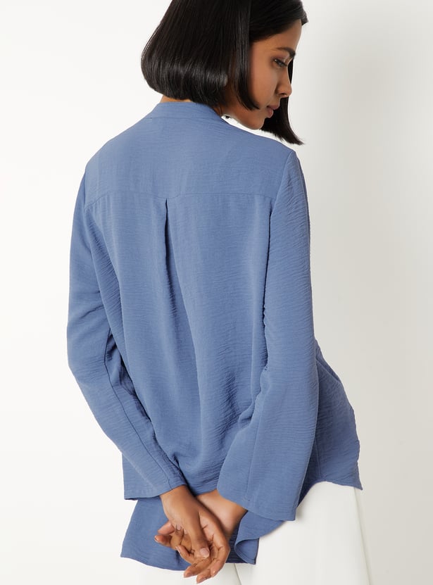 Elevate your everyday style with this textured blouse, featuring a band collar, button placket, and full sleeves with fold tabs for versatile wear. Model Size :