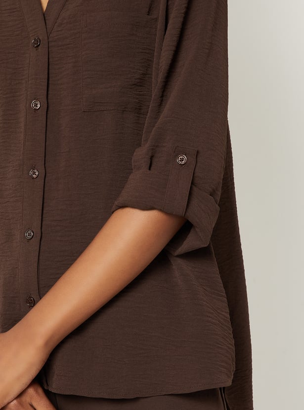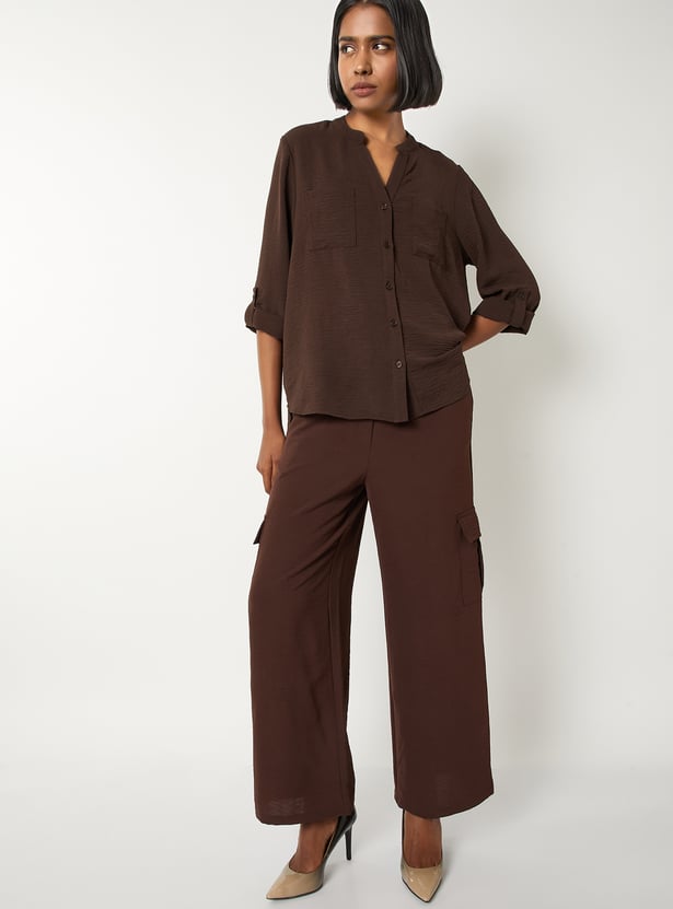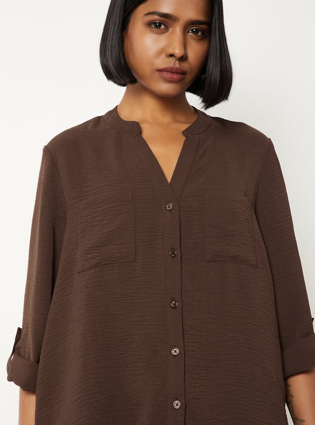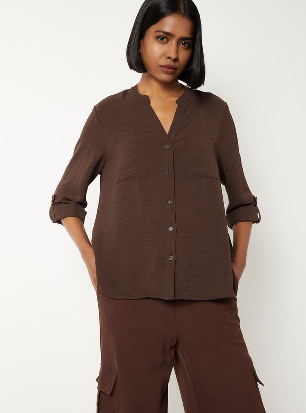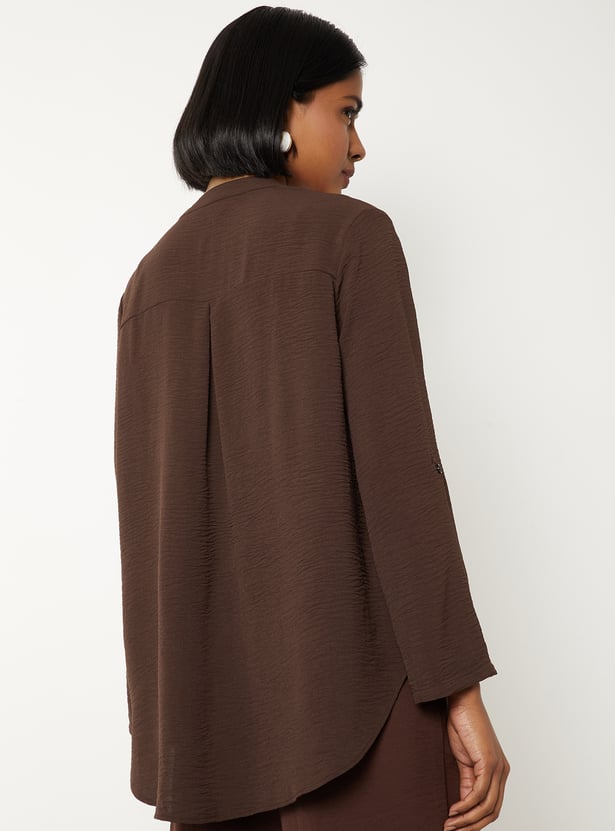 Elevate your everyday style with this textured blouse, featuring a band collar, button placket, and full sleeves with fold tabs for versatile wear. Model Size :