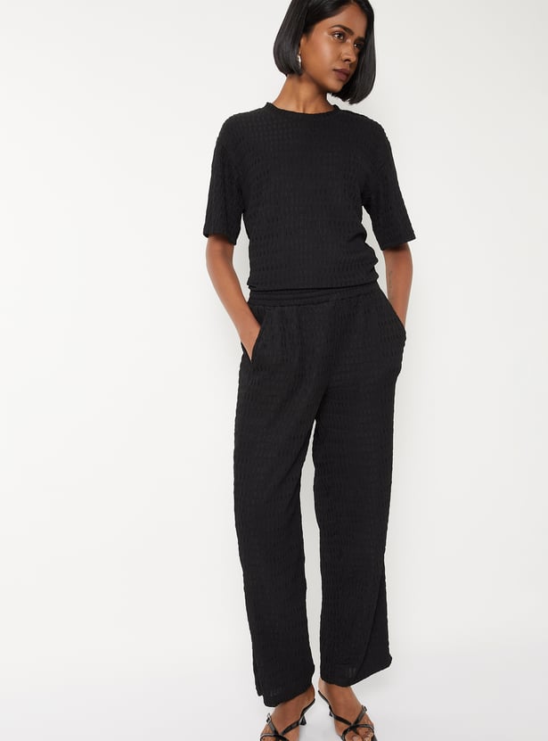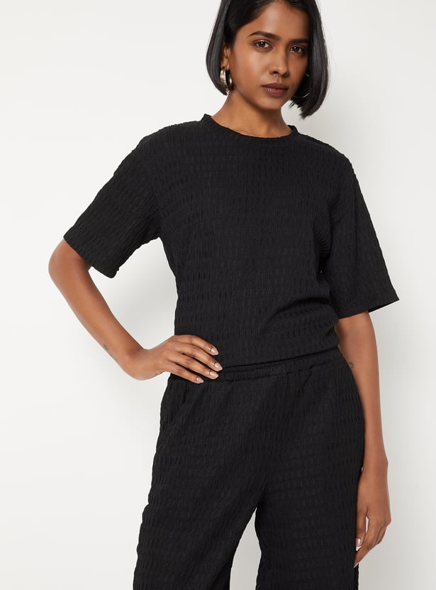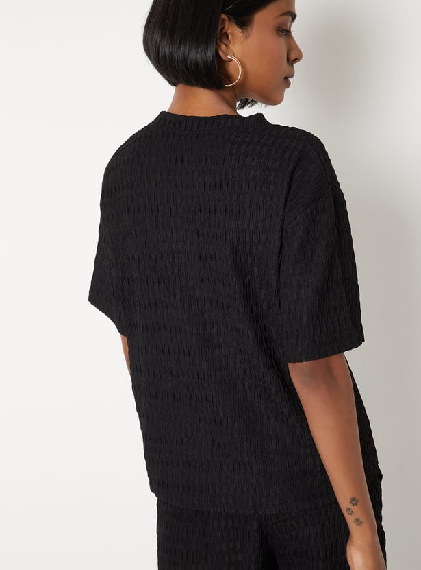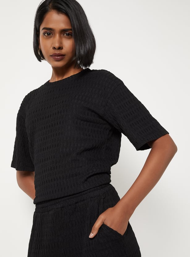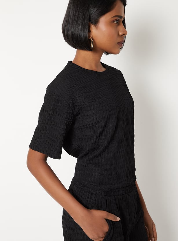 Step up your casual style with this textured drop shoulder top, designed for effortless comfort. Featuring a classic crew neck and relaxed half sleeves, it offers a laid-back yet polished look. The textured fabric adds subtle visual interest, making it perfect for everyday wear.