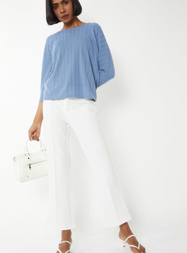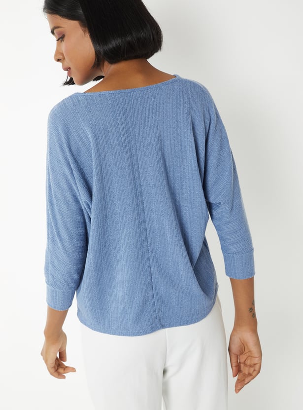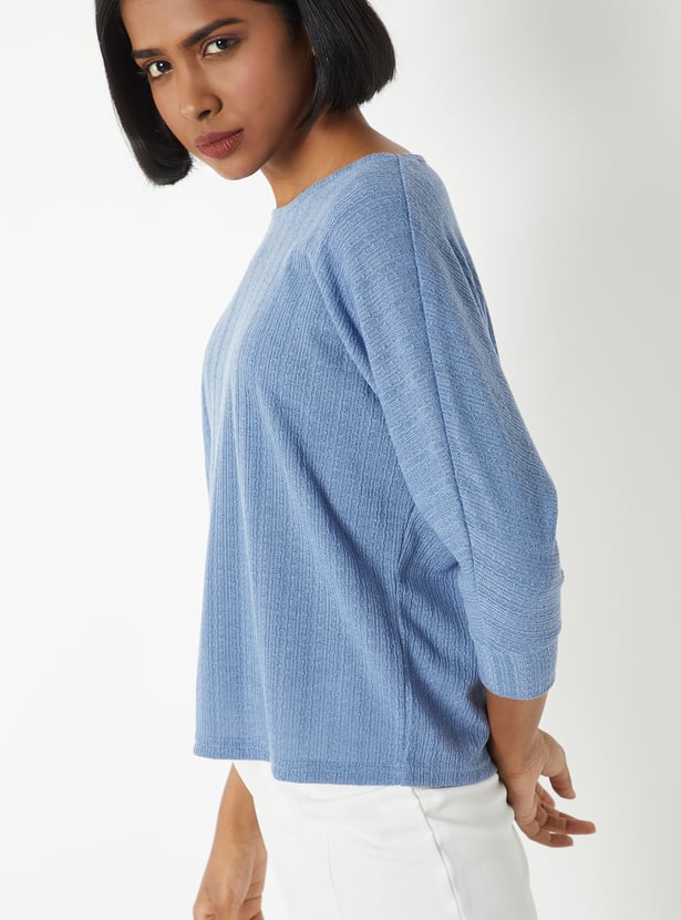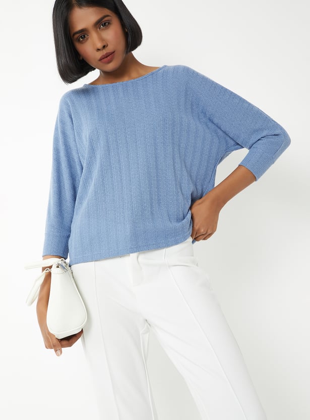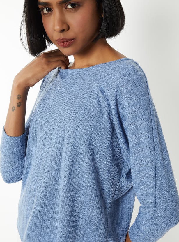 Elevate your style with this textured knit top, featuring a graceful boat neck and relaxed batwing three-quarter sleeves for a modern silhouette. The soft texture adds depth, while the draped sleeves offer effortless movement and comfort—perfect for brunch dates, office chic, or cosy evenings out.