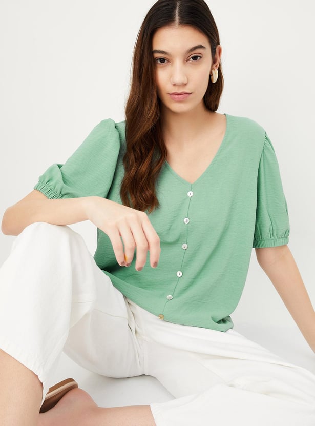 Upgrade your wardrobe with this shirt-style top. It has a hammered textured finish with a front shell button placket, V-neck, and puffed sleeves.