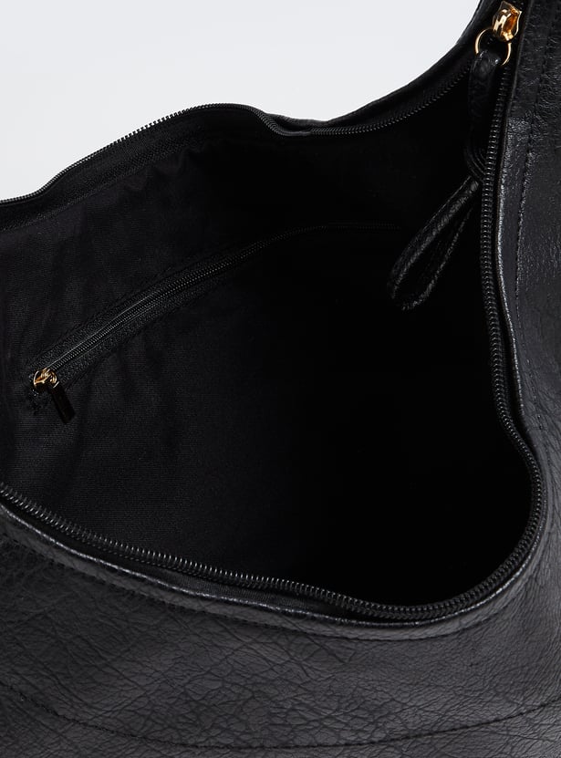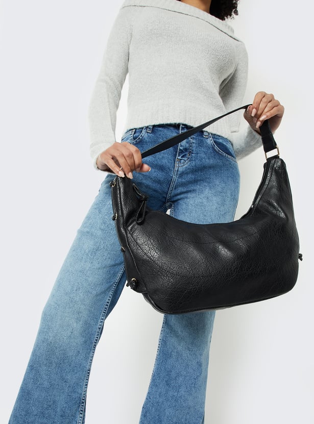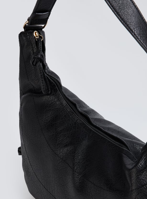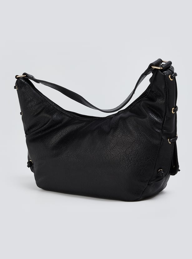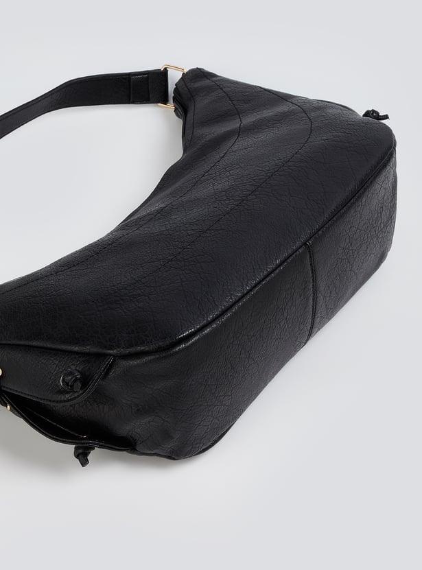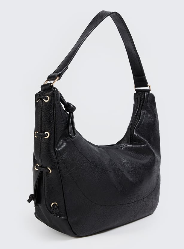 Carry your essentials in style with this textured shoulder bag featuring side tie details and a secure zip closure. Sleek and versatile, it's perfect for both everyday wear and casual outings.