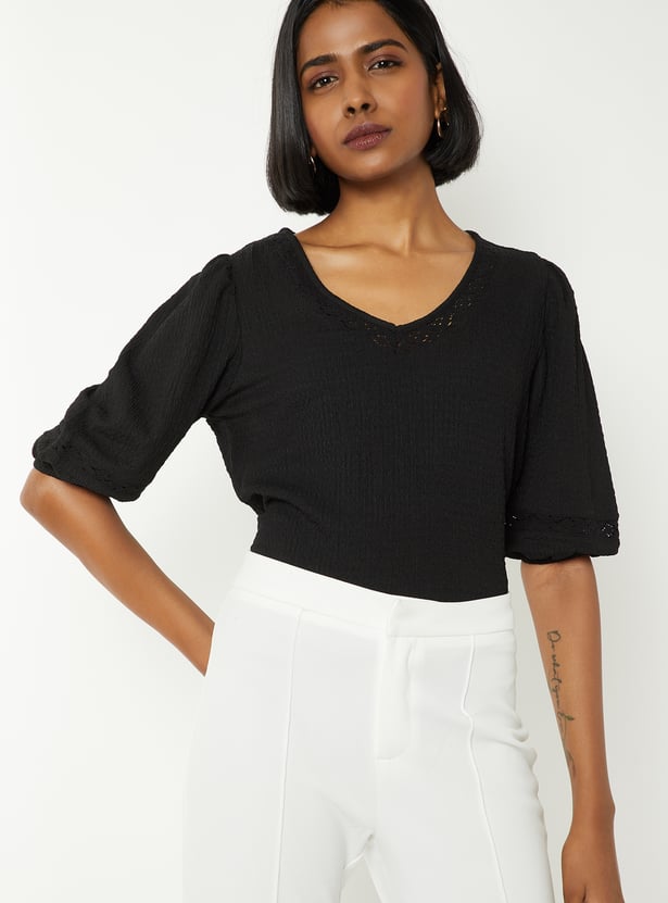 Step out in chic simplicity with this textured top. Featuring a V-neck and puff half sleeves, it’s perfect for a stylish yet comfortable look.