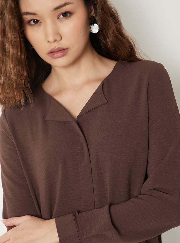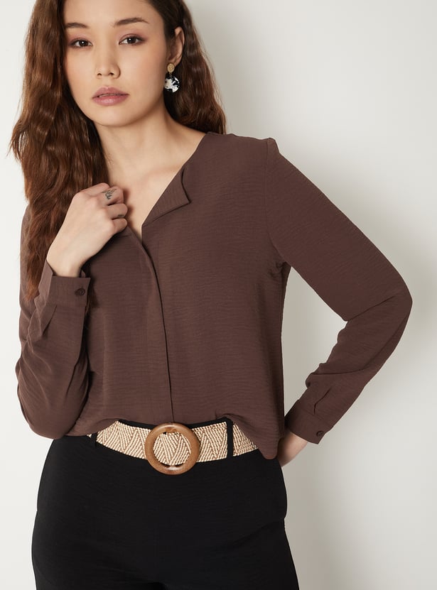 This textured top features a refined lapel collar and full cuffed sleeves, bringing a polished twist to an everyday silhouette. The subtle texture adds depth and elegance, making it a versatile piece for both workwear and casual outings. Model Size :