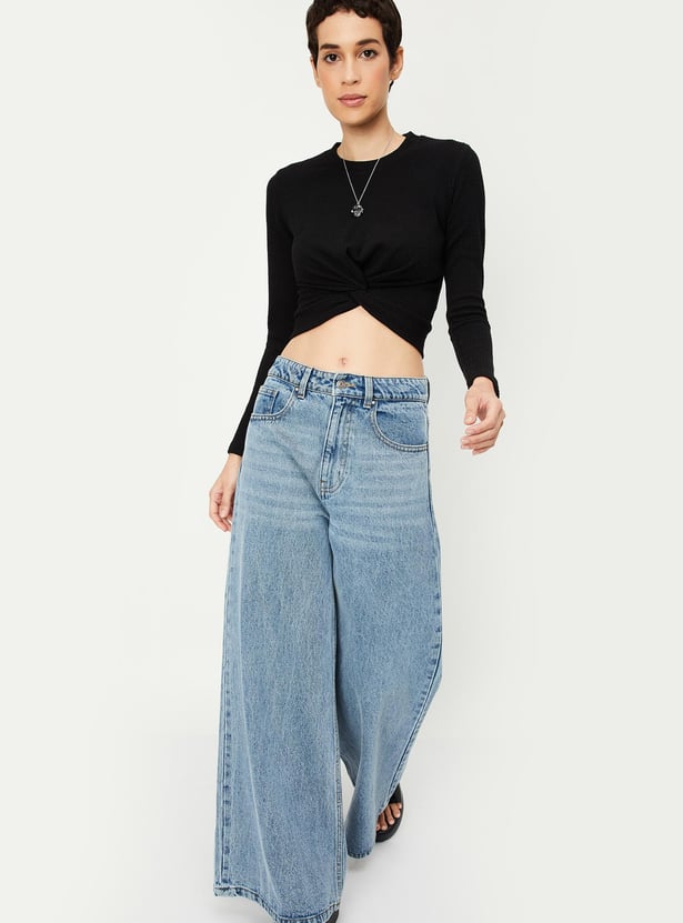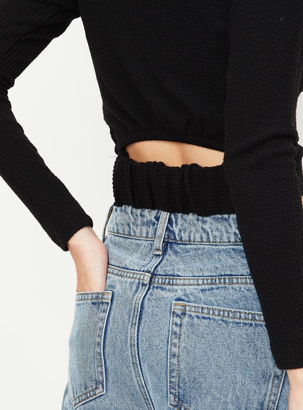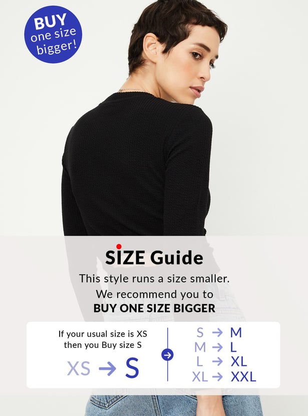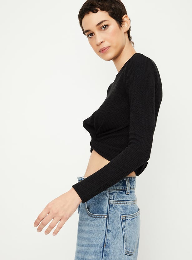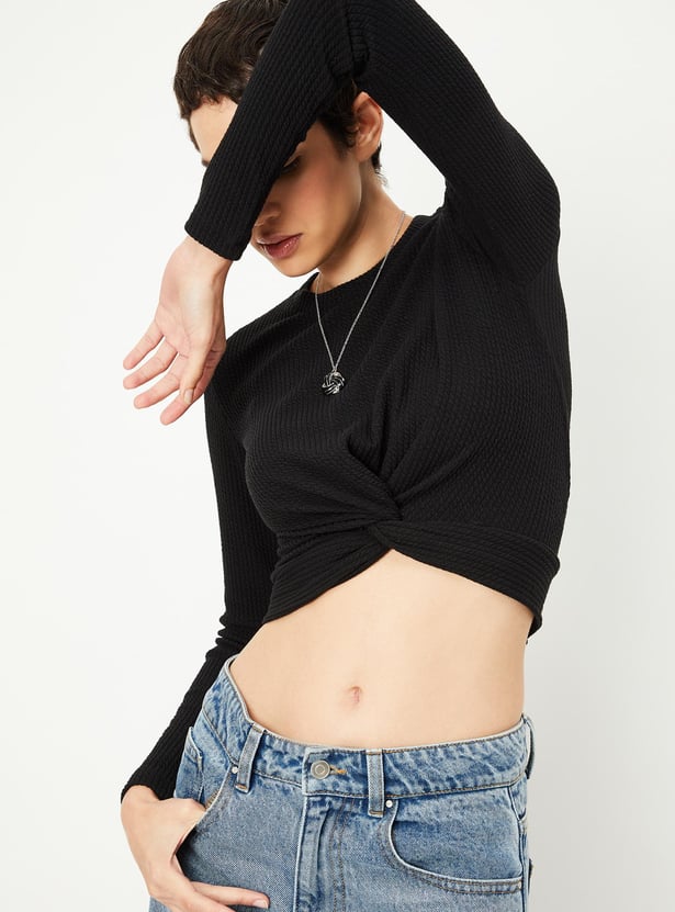 Elevate your casual wardrobe with this fashionable top, featuring a twisted waist, cut-out detail, round neck, full sleeves and cropped profile. Style it with a pair of jeans and other accessories.