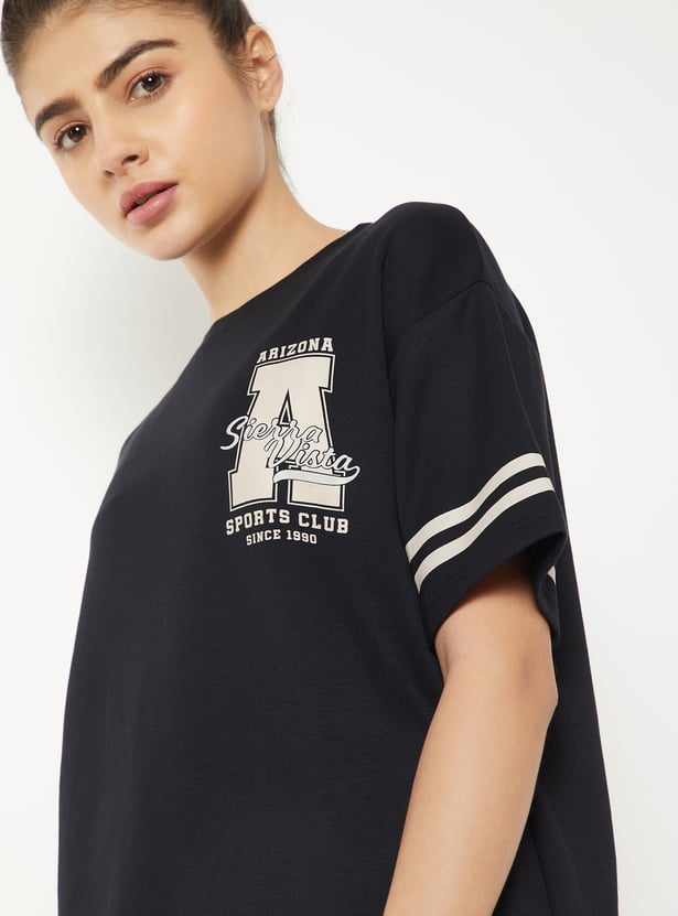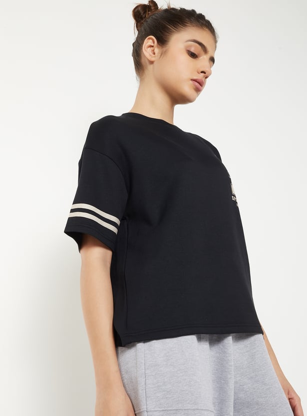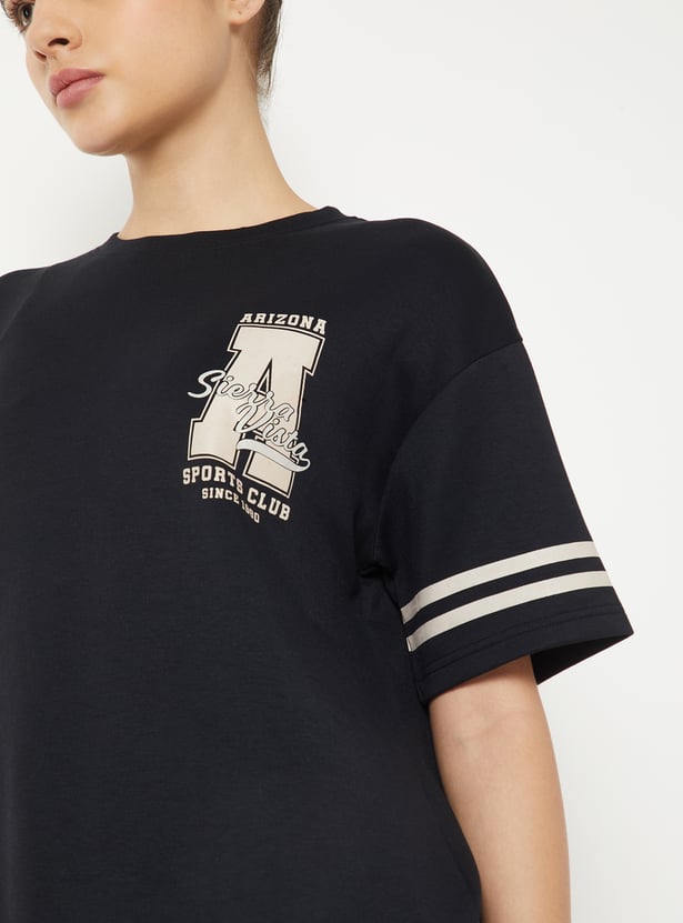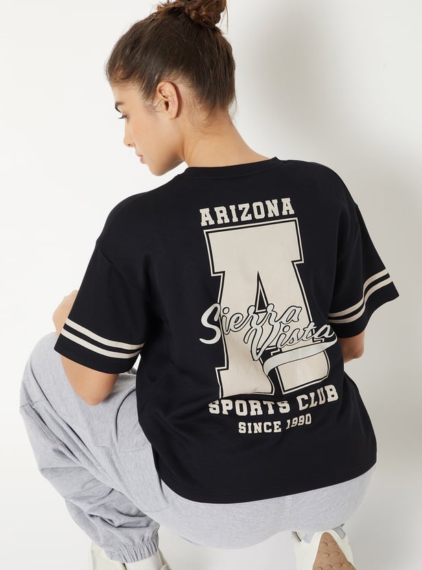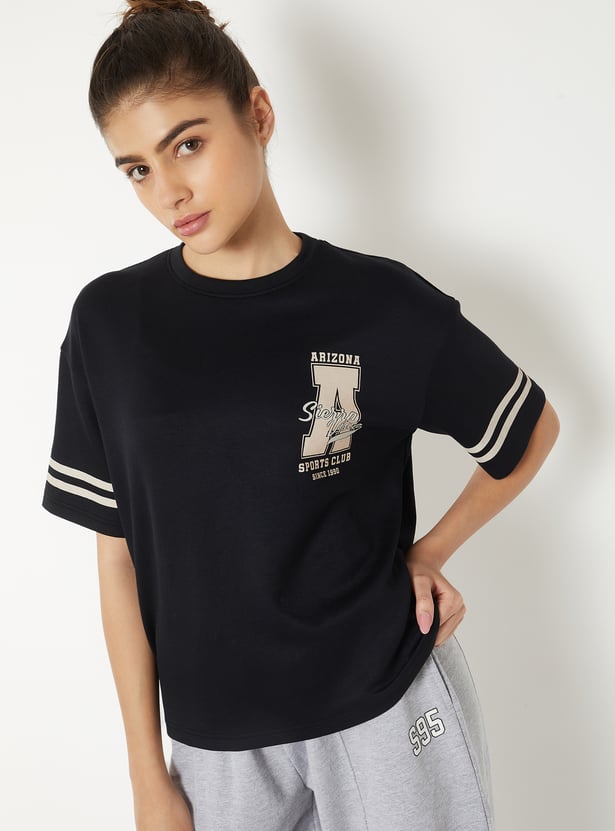 Sporty and statement-making, this T-shirt brings a cool edge to everyday looks. Designed with a round neck, drop shoulders, and half sleeves finished with stripe detailing, it features a relaxed boxy fit. The bold varsity print on the back brings a standout style.