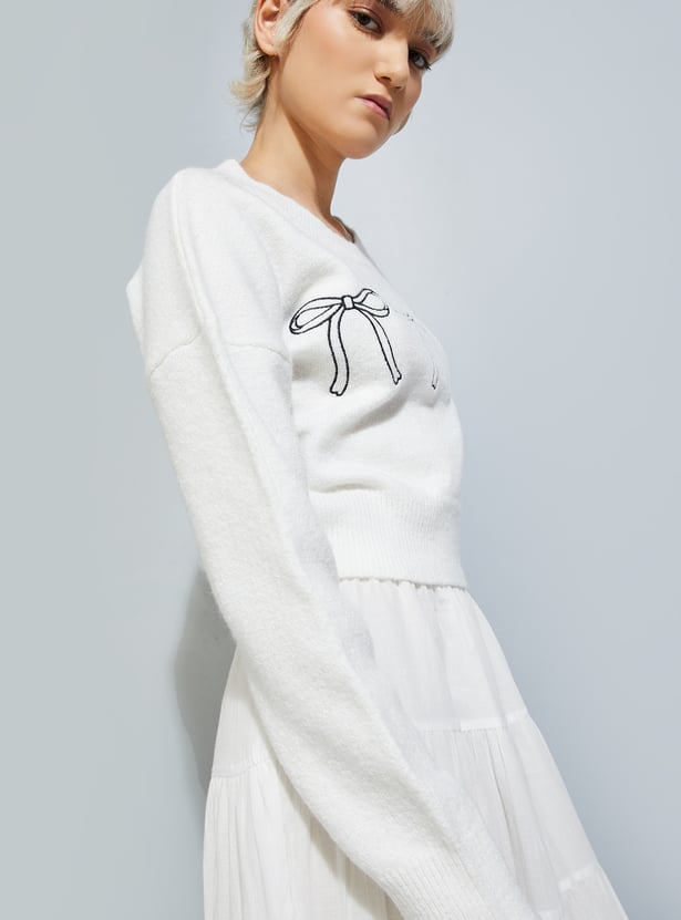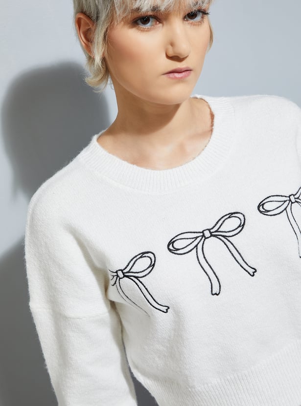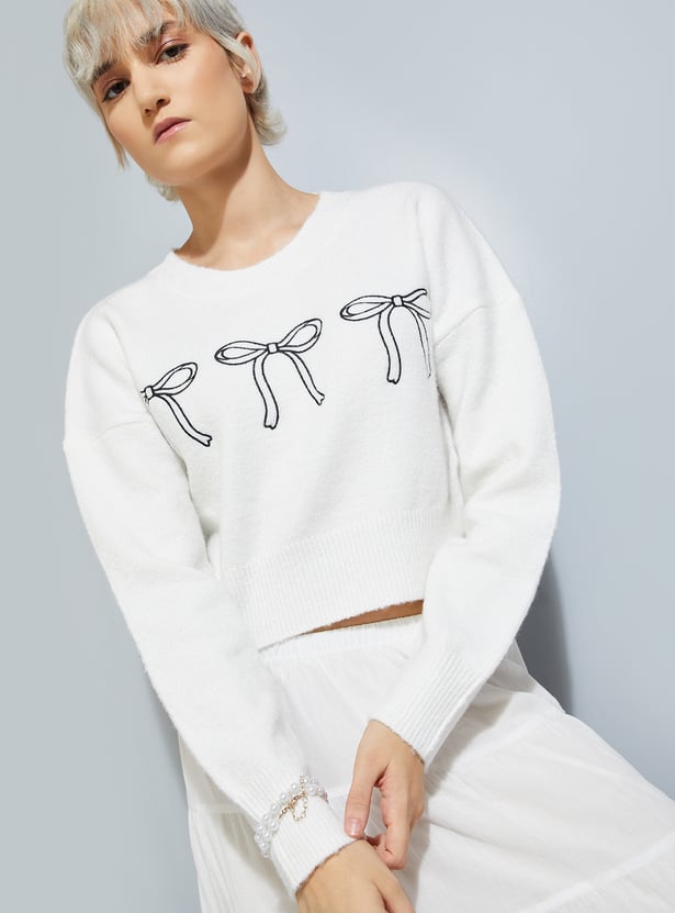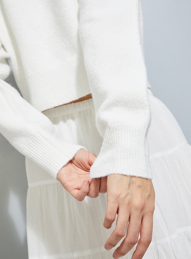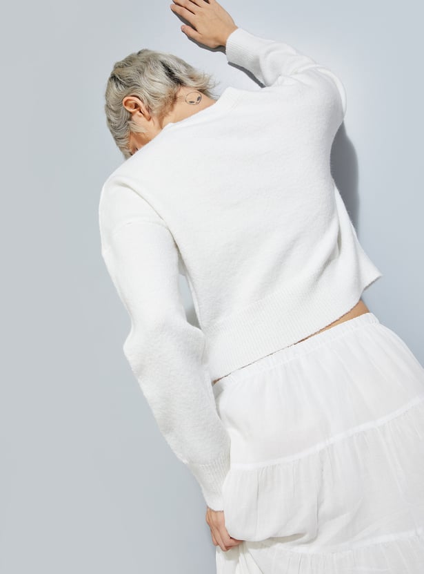 Stay cozy and stylish with this knit crop sweater. Featuring a round neck and full sleeves, it offers a snug, comfortable fit while keeping your look trendy and chic.