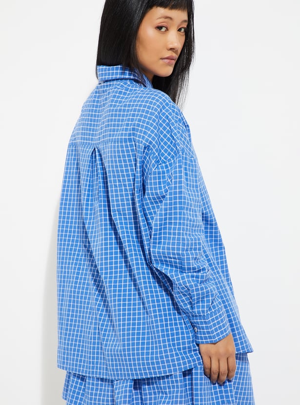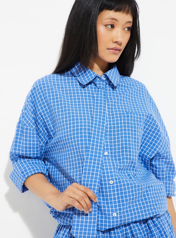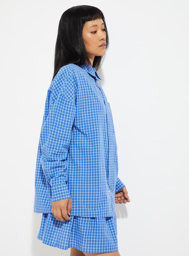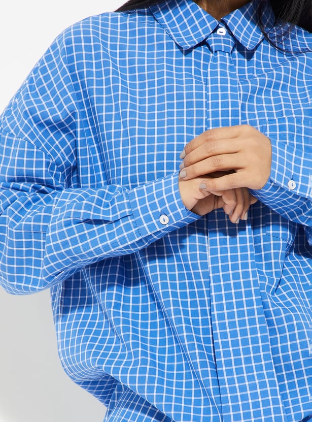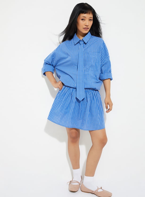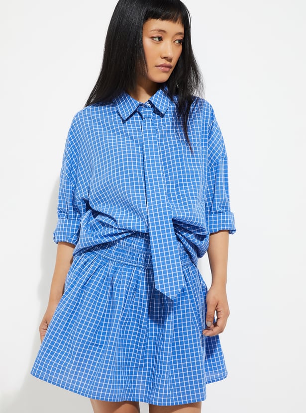 Refresh your casual wardrobe with this checked shirt designed for relaxed style. Featuring a spread collar, full sleeves, button placket, curved hem, and tie detail with an oversized fit.