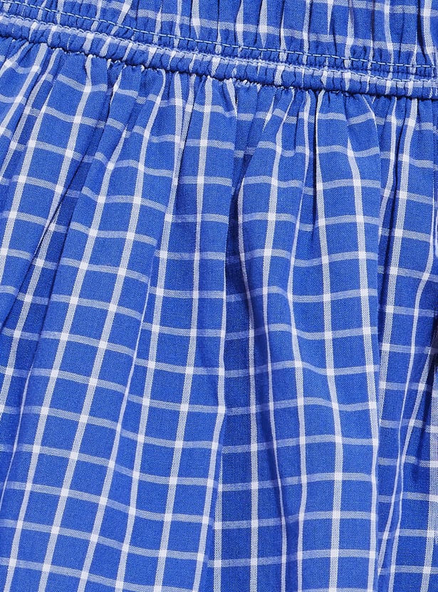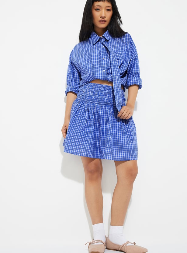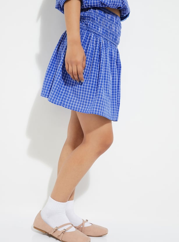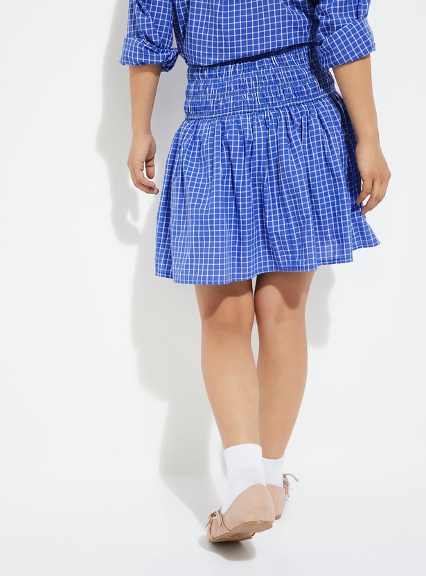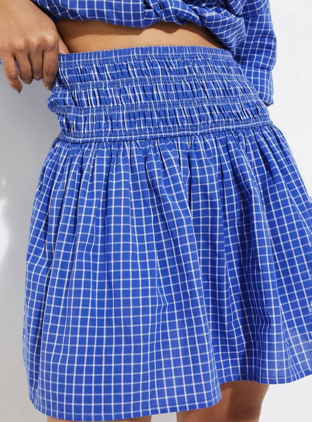 Playful yet chic, this checked smocked waist skirt is designed with an elasticated waistband for all-day comfort and a flattering fit. Its mini length adds a youthful edge, making it a versatile piece for casual outings or weekend getaways.