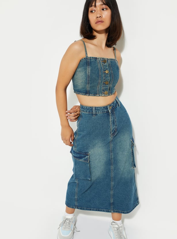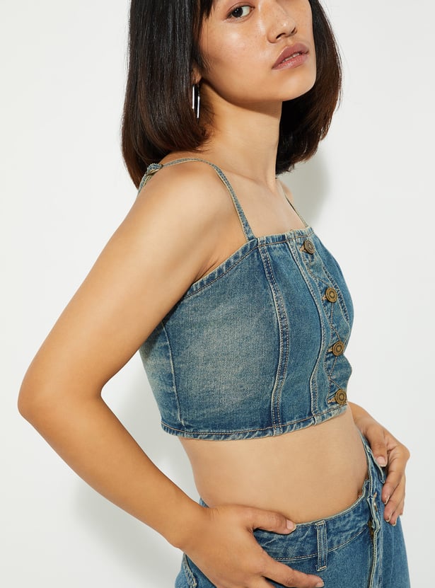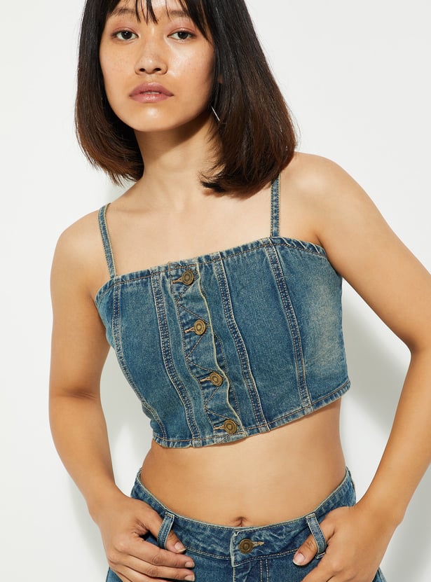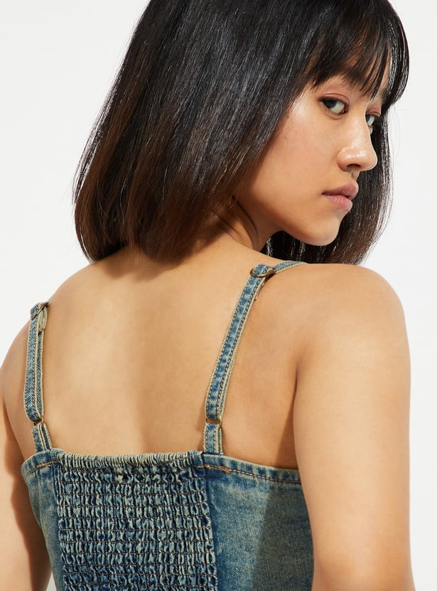 For your trendy casual style, here's a sleek denim bralette top featuring an elegant square neck, smocked back, and adjustable straps for a functionally elegant fit.