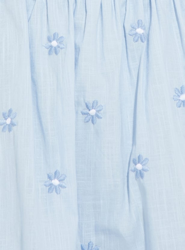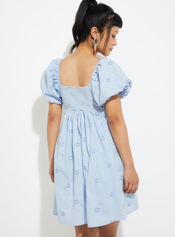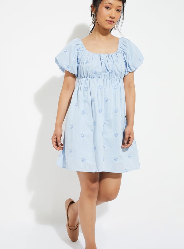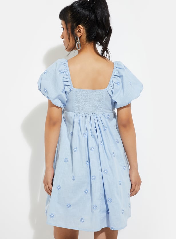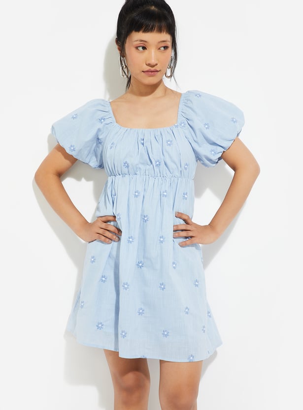 Graceful and charming, this embroidered A-line dress features a square neckline and puff half sleeves for a romantic silhouette. Designed in a mini length, it combines playful elegance with timeless detailing.