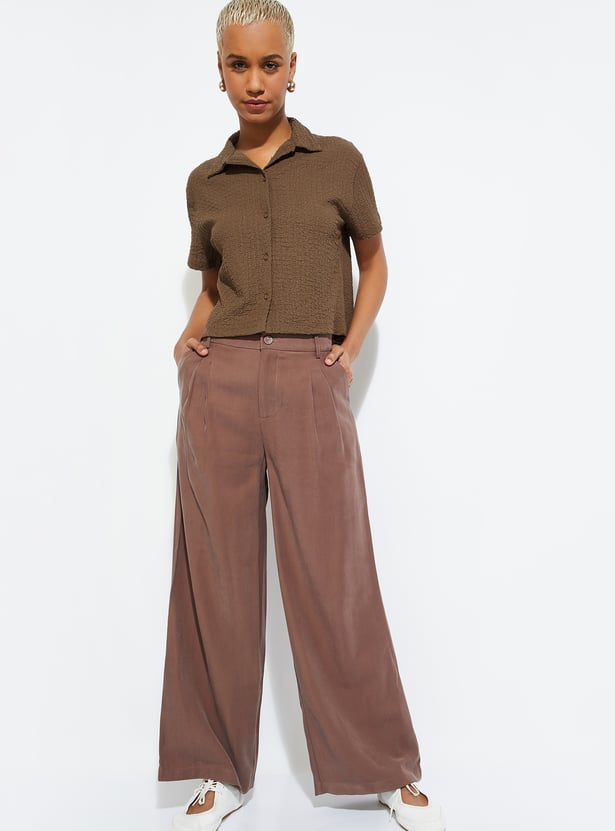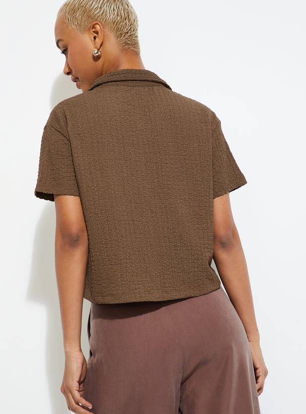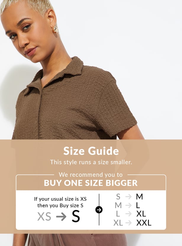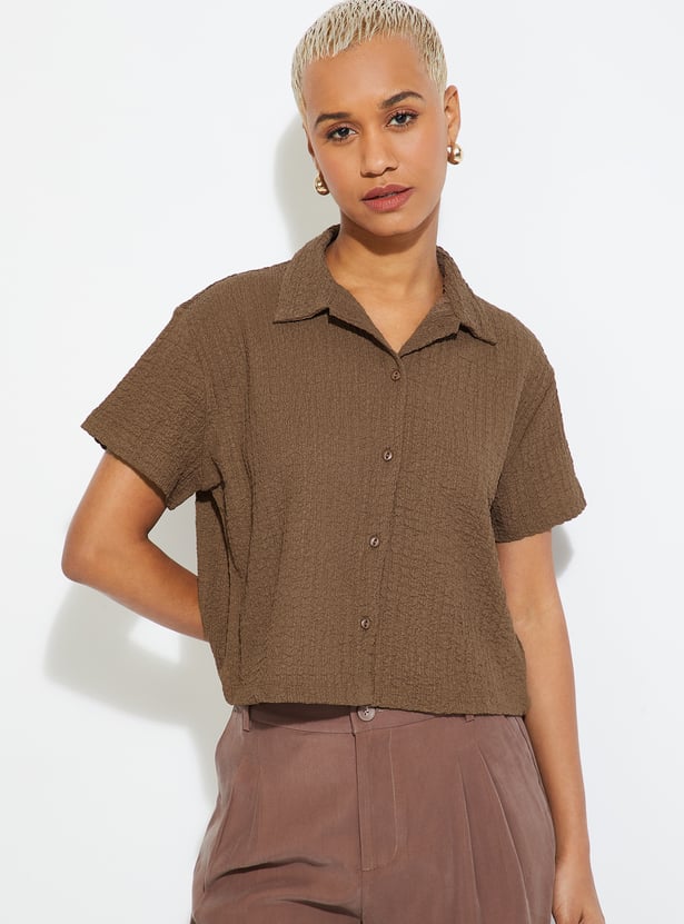Trendy and modern, this textured boxy fit crop shirt features a relaxed spread collar and a neat button closure. The half sleeves add comfort and ease, while the cropped silhouette gives it a chic, contemporary edge.
