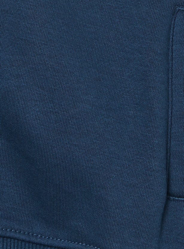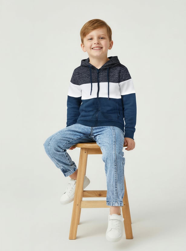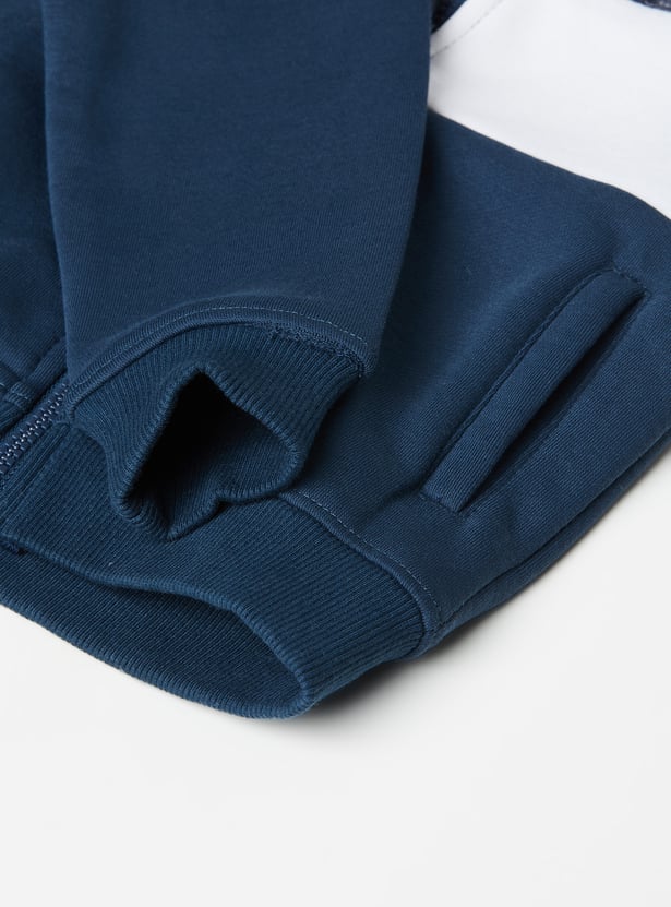 This colourblock hooded sweatshirt brings a sporty edge to his everyday style, featuring a full-zip closure, comfy full sleeves, and snug ribbed hems for a neat finish.